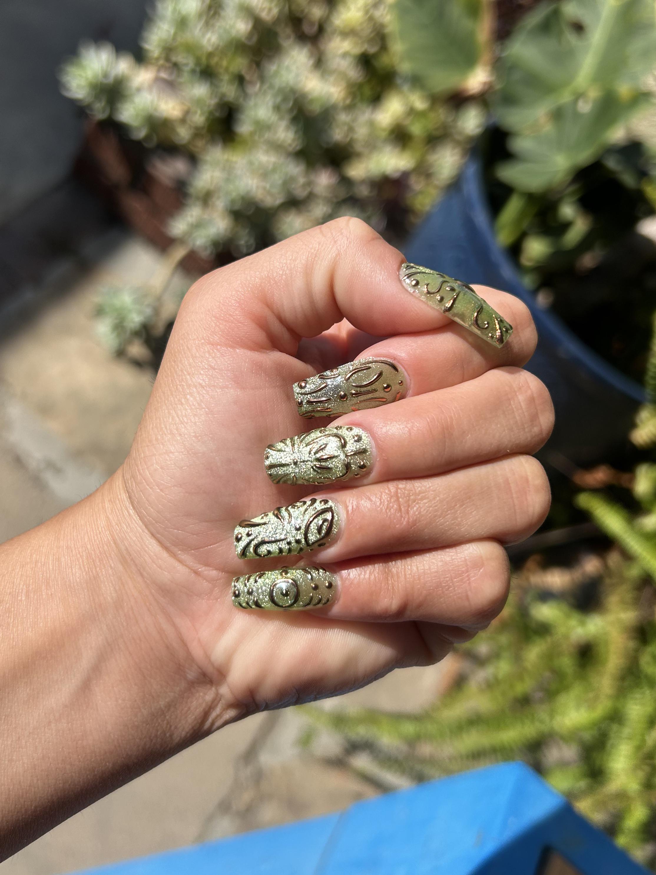 New set done by my best nail tech ever, so happens to be my brothers gf. Needless to say I’m spoiled 🥹. Light green cat eye with gold chrome designs and snuck in weed leaf. by techno_b_