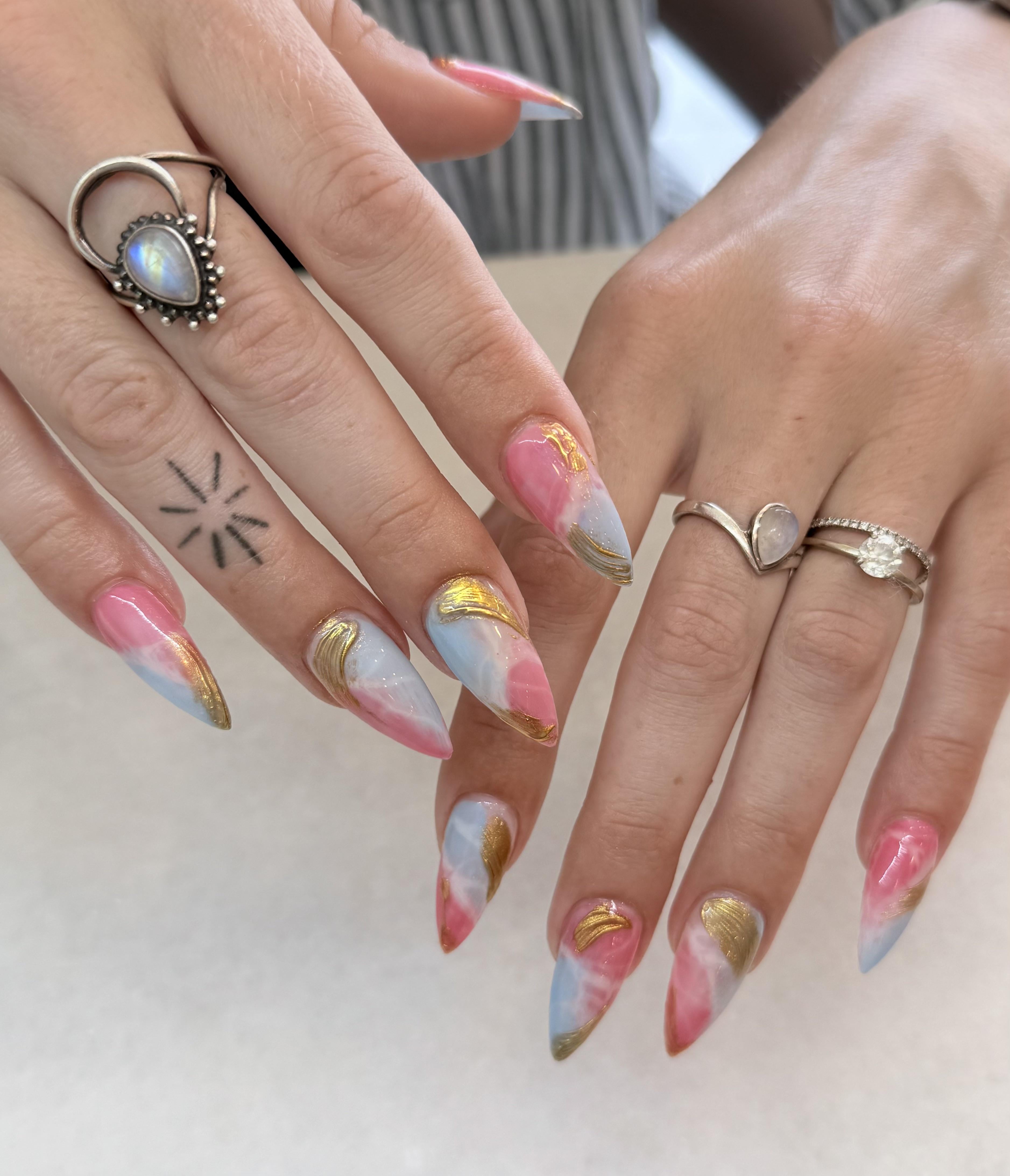 emberecho1256 on April 17, 2026 1:47 am Damn wow these are so pretty. the colors blend so nicely the gold details make it look extra special. perfect birthday nails 🎉 also wish u a really really happy birthday to u.
