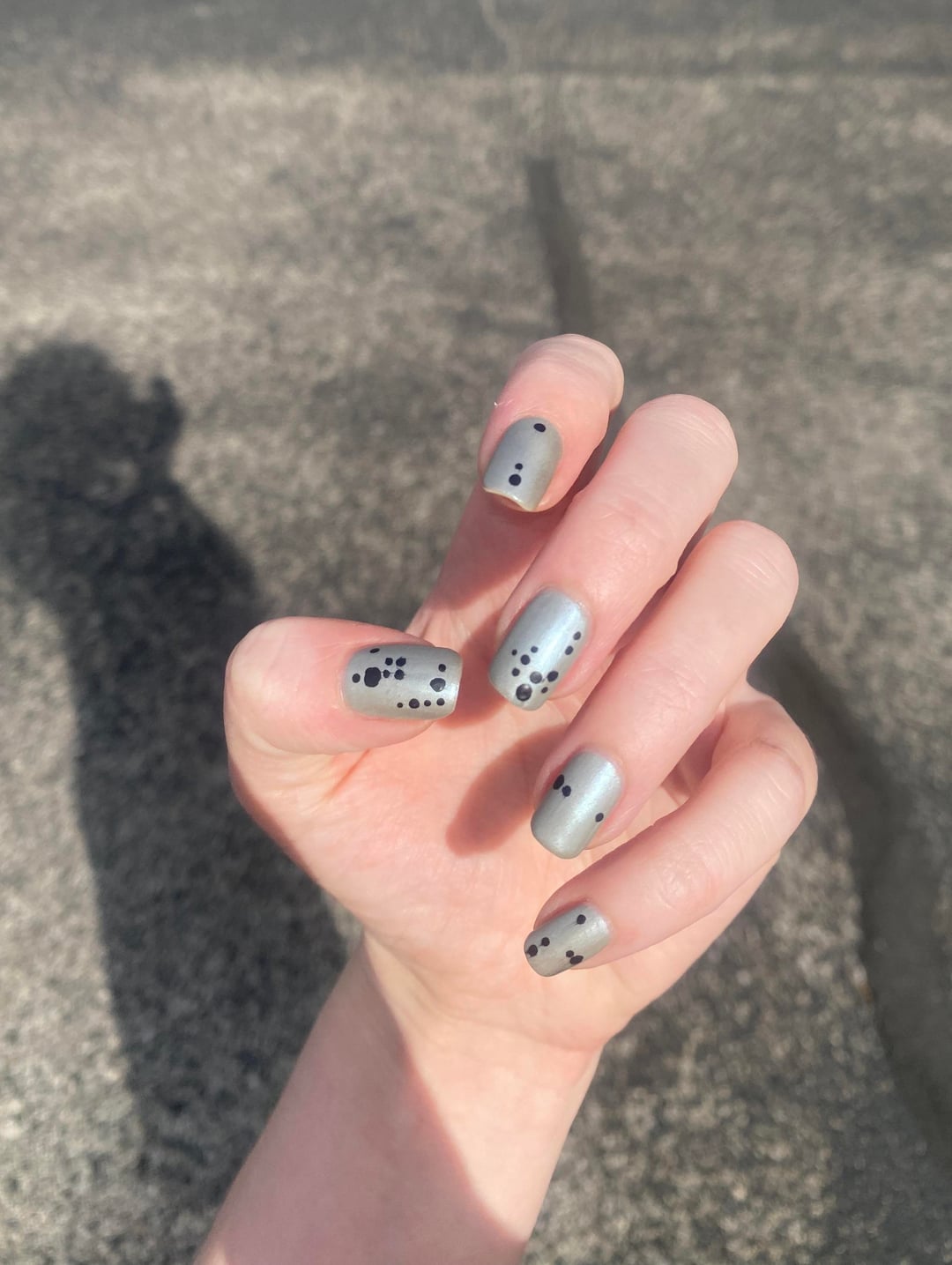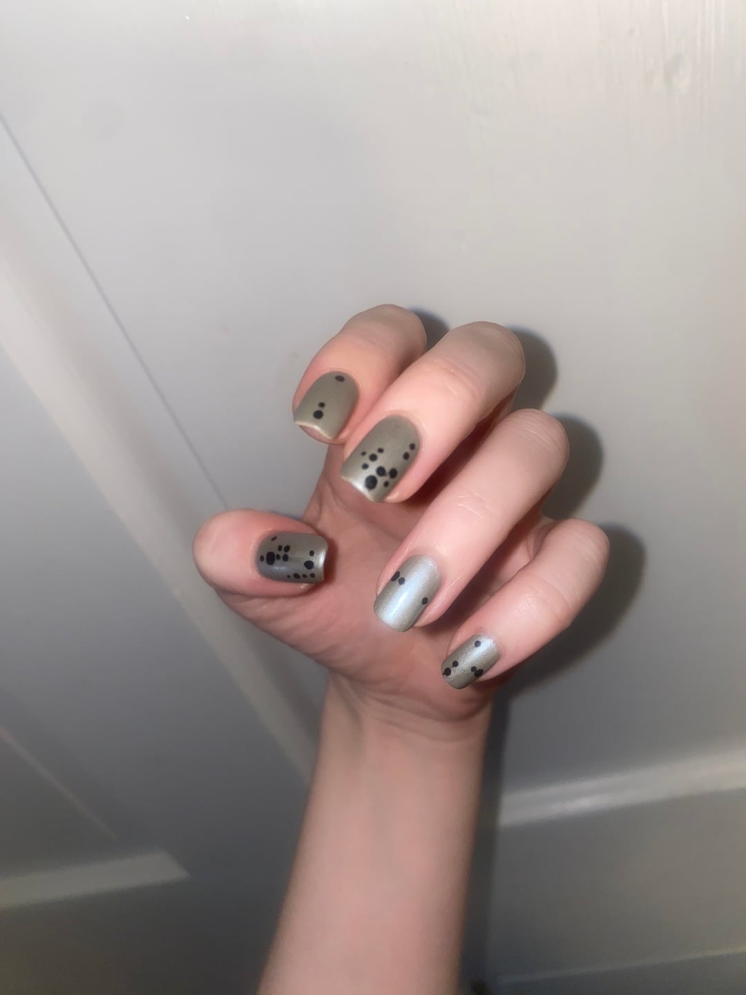 •1x Essie smooth e base •2x Cracked “Don’t Eat That” •1x Essie Gel Couture qdtc • Black dots with Haunted “Goth” using dotting tools •1x Essie Gel Couture qdtc •1x Cracked matte tc