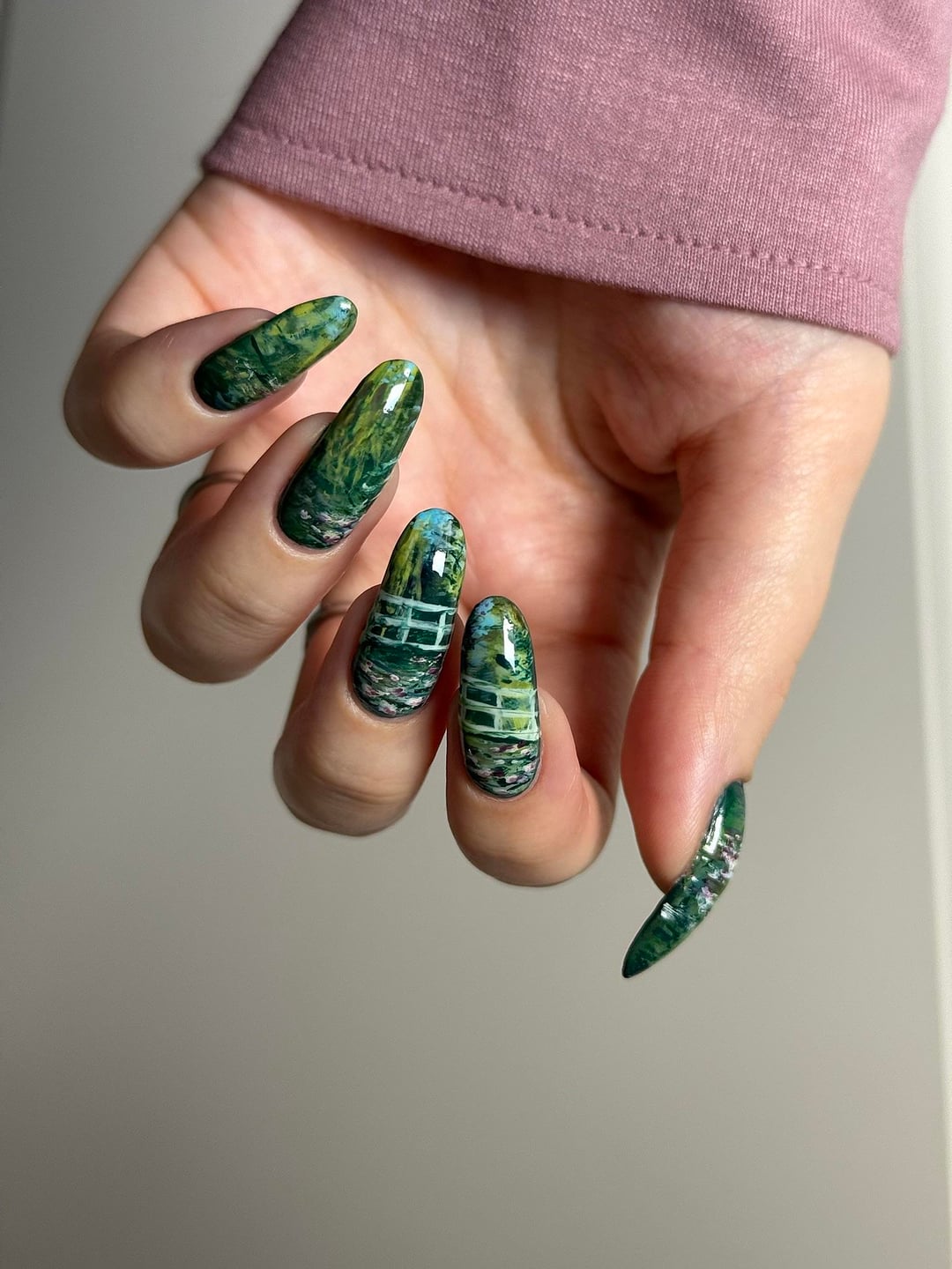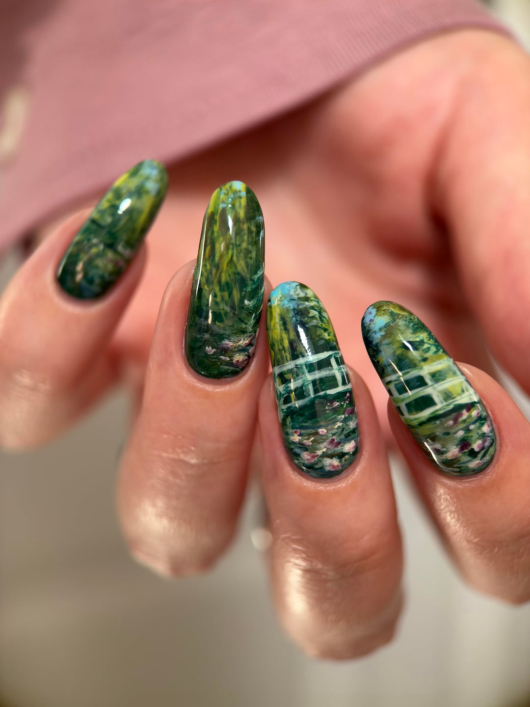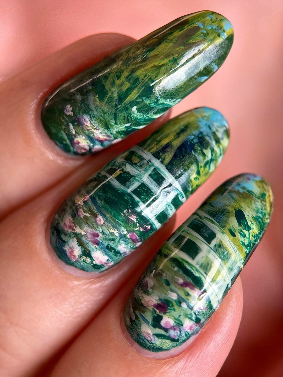 📸 I painted these nails for a very fun collab on insta in which we each get assigned another lacquerista in secret and we copy a manicure from them. I'm @bettinas.nails over there and the person I copied is @holonessie. I loved her composition for paraphrasing this painting; she came up with the idea to have the bridge cross over two nails.