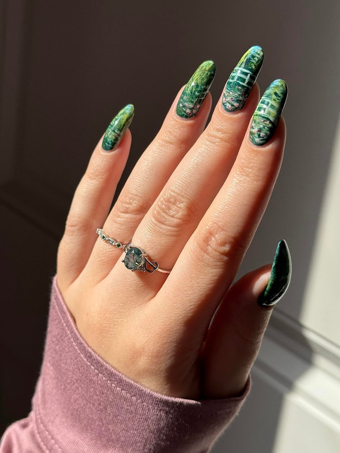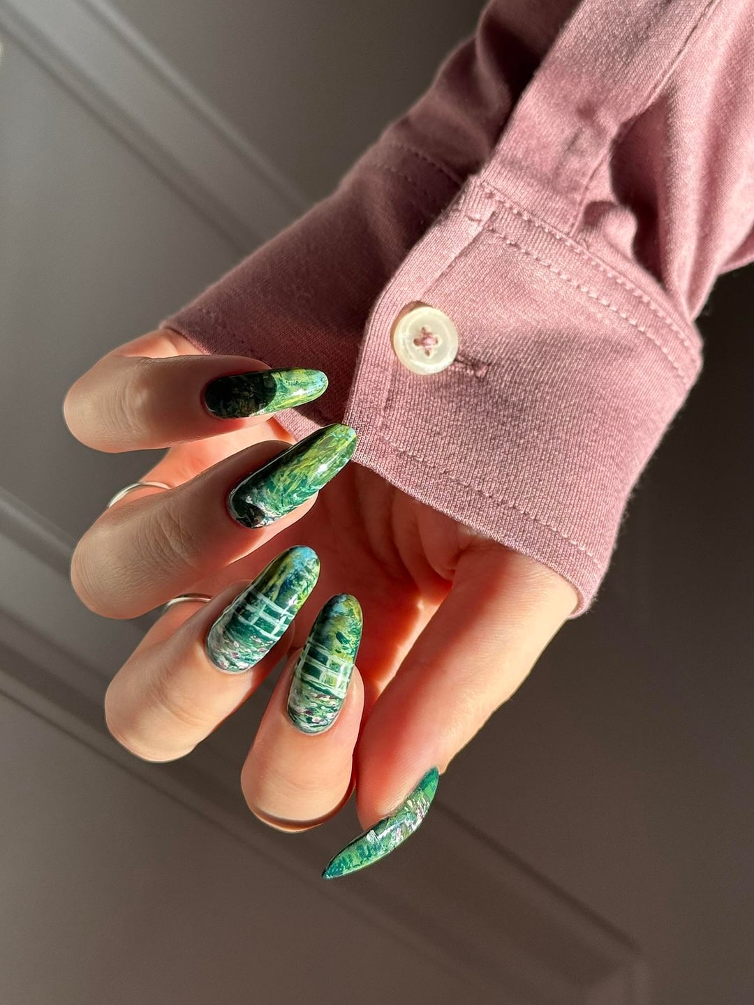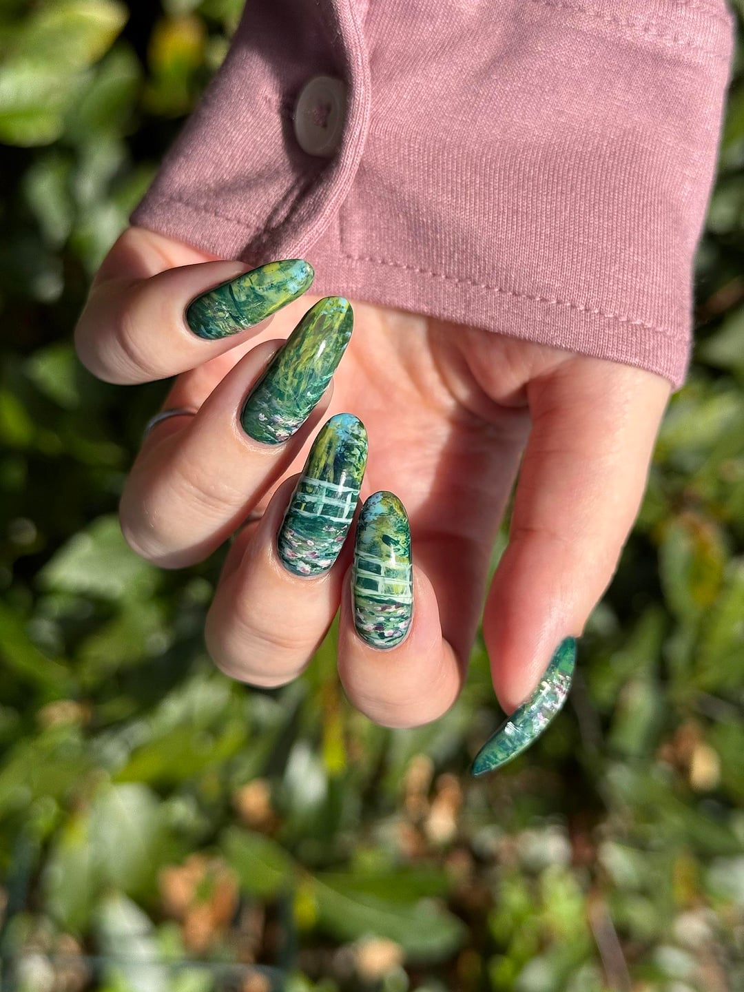 📸 I painted these nails for a very fun collab on insta in which we each get assigned another lacquerista in secret and we copy a manicure from them. I'm @bettinas.nails over there and the person I copied is @holonessie. I loved her composition for paraphrasing this painting; she came up with the idea to have the bridge cross over two nails.