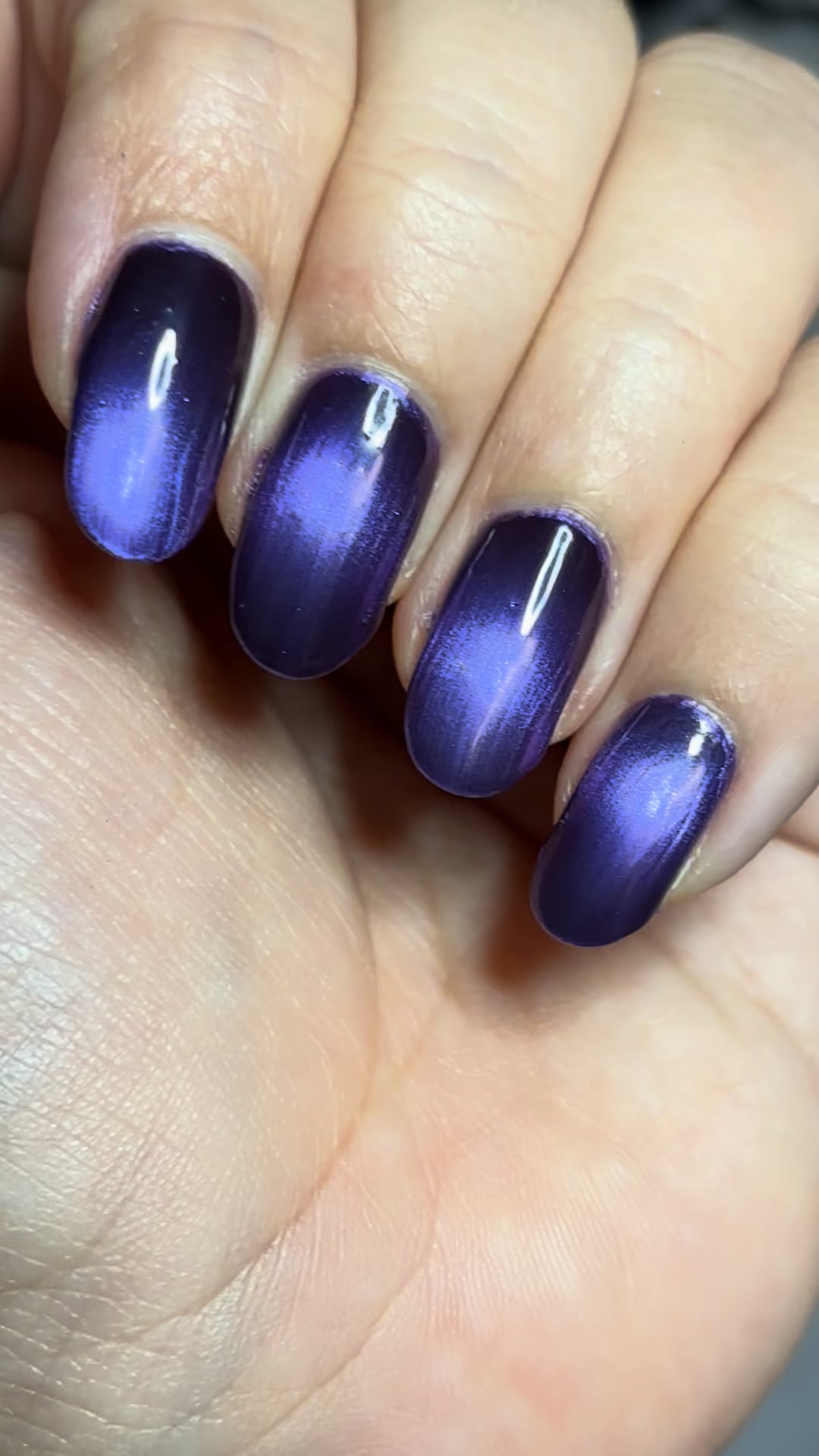 The effect is soooo pretty that I wanted to take a video before potentially ruining it with top coat. The purple is WAY warmer than it shows up here. It looks indigo in the video but it's actually warm purple. Impressed so far, we'll see how it holds up with top coat!