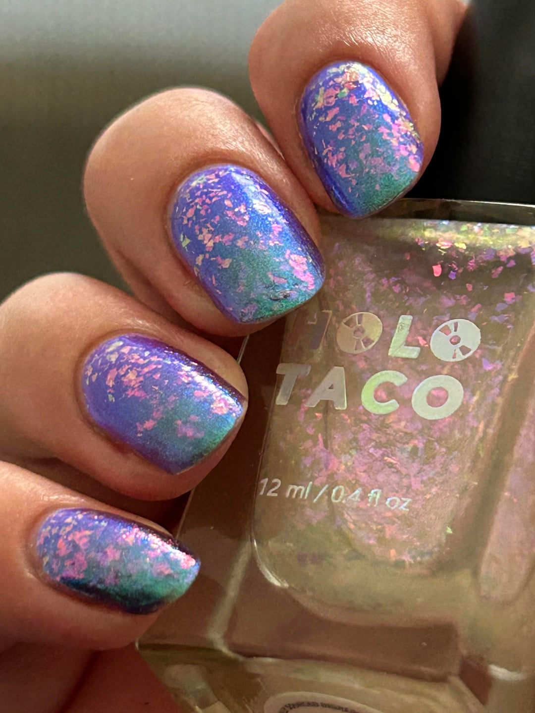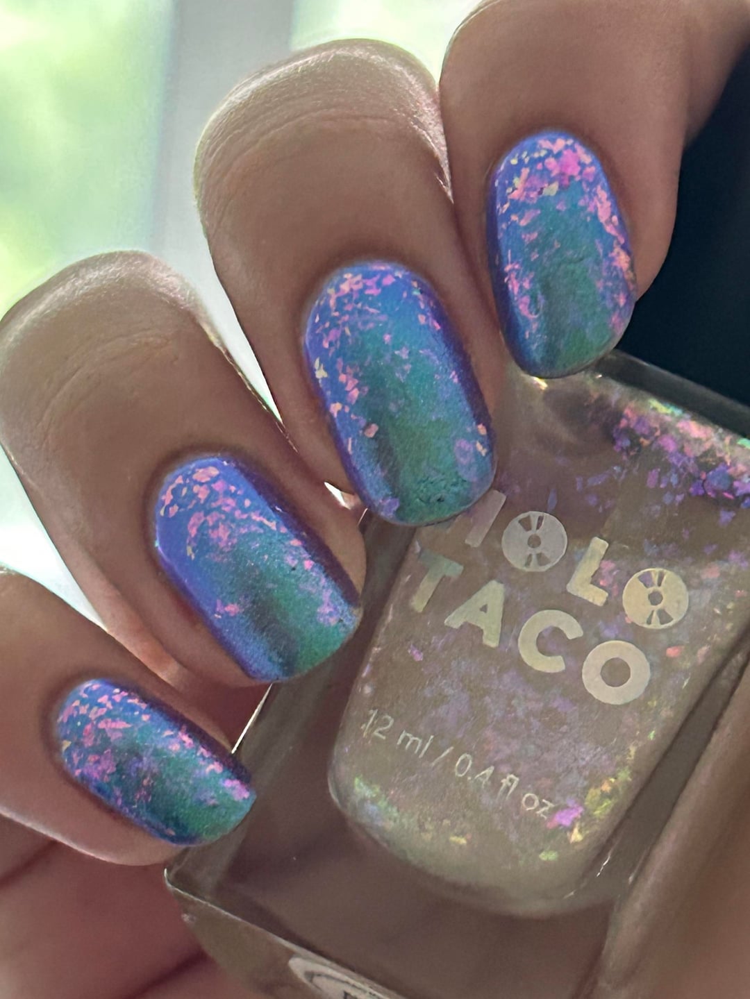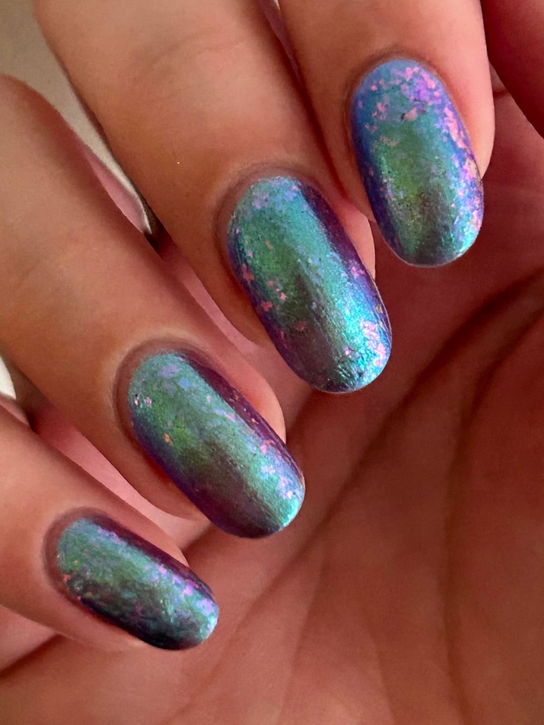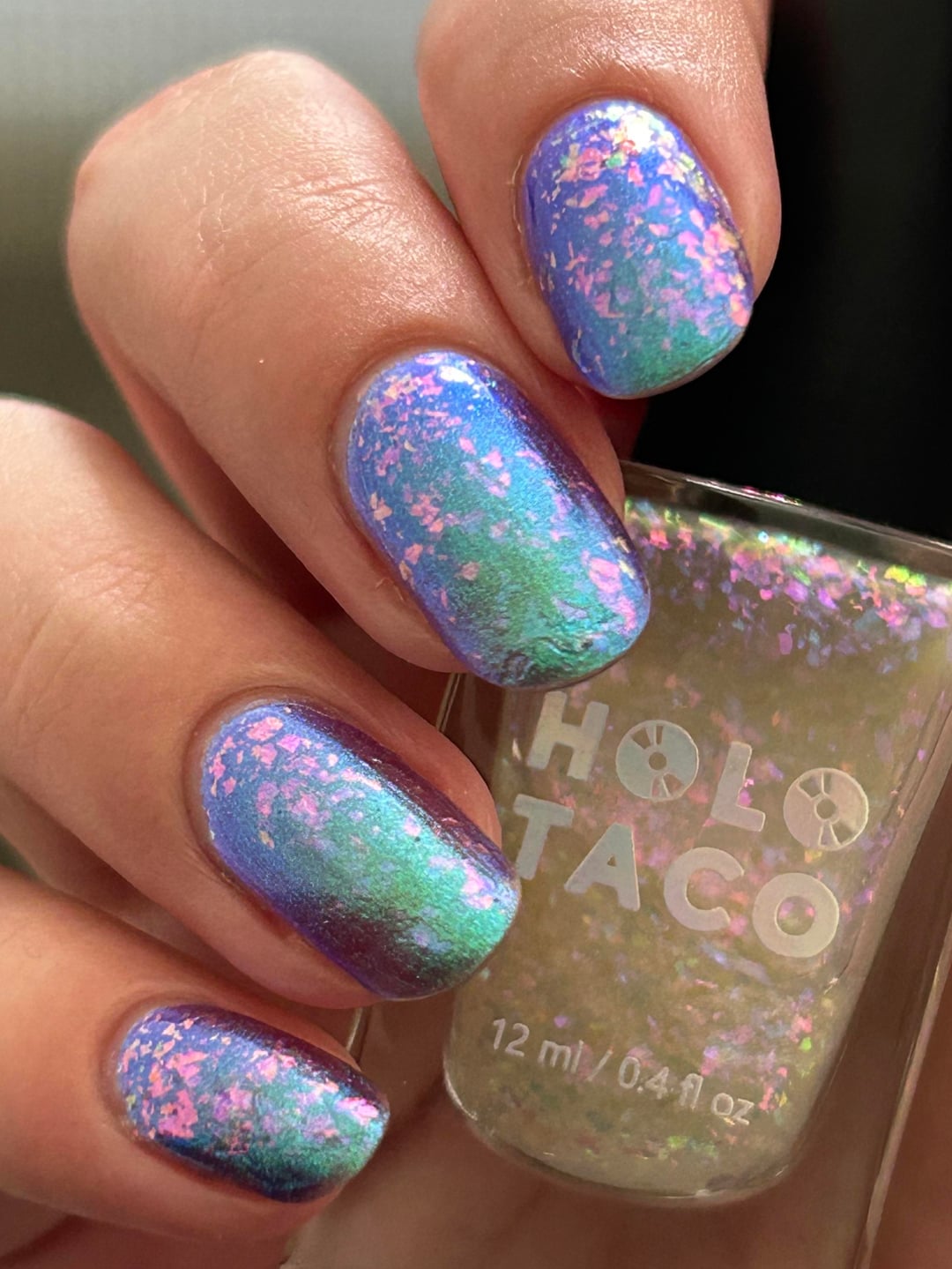 I think it looks better in person, for some reason the flakies were really hard to get on camera. I really love the look of this combo tho, head on you see the green shimmer in the middle with the blue shimmer and pink flakies popping out around the edges. It almost makes the blue almost purple in some angles, would definitely recommend trying this combo if you have both polishes at some point 🙂