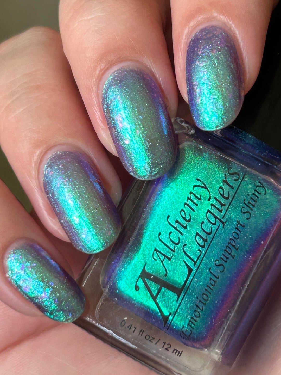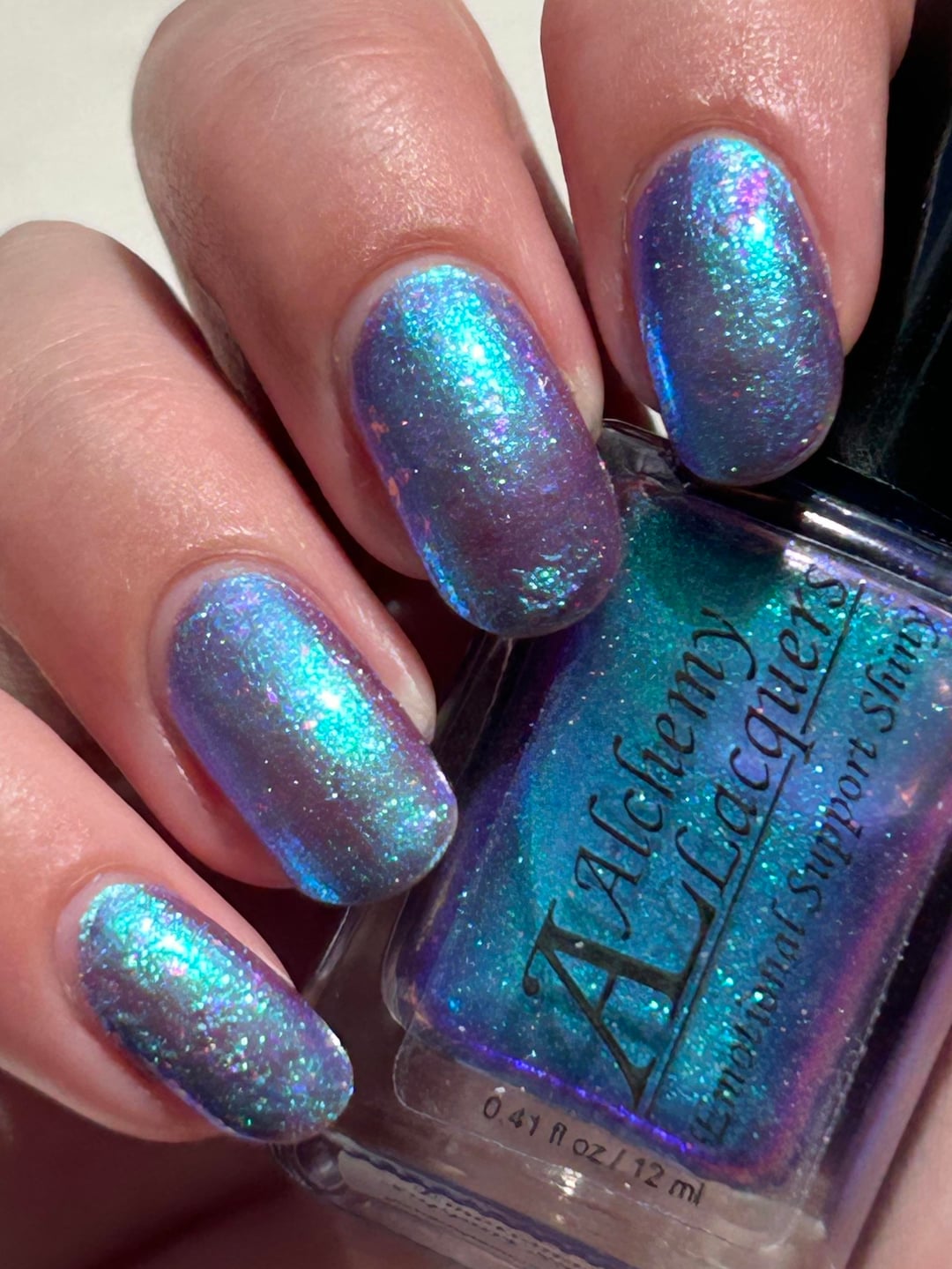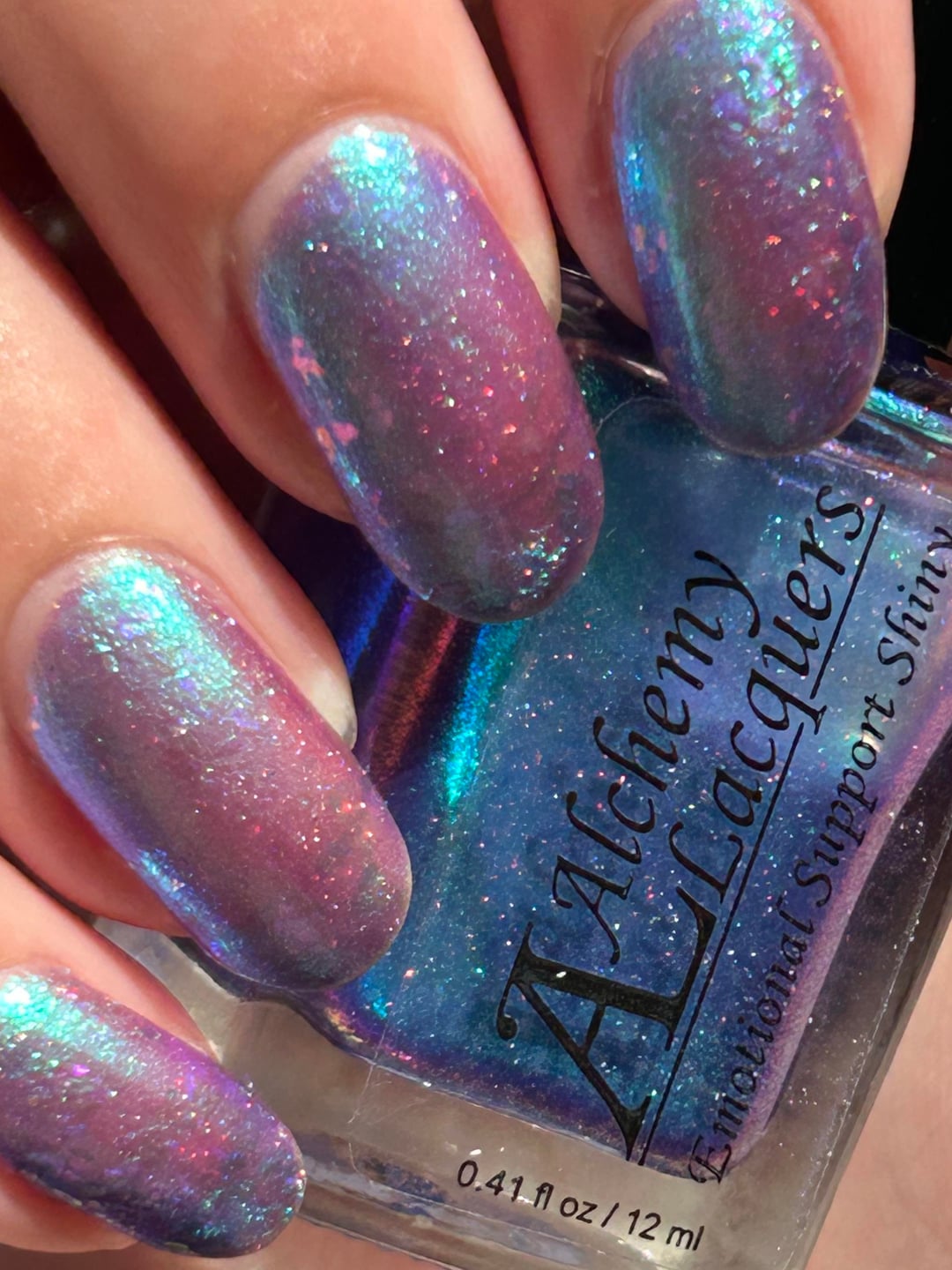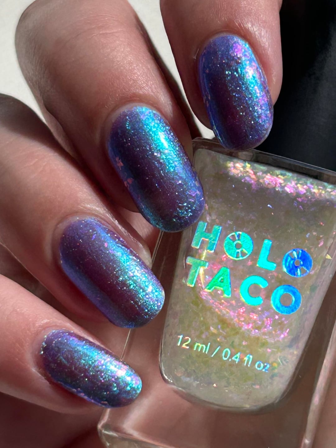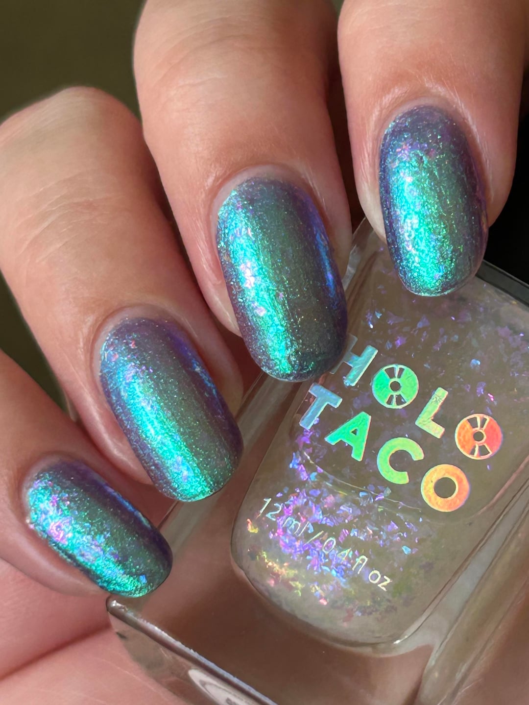 I think it looks better in person, for some reason the flakies were really hard to get on camera. I really love the look of this combo tho, head on you see the green shimmer in the middle with the blue shimmer and pink flakies popping out around the edges. It almost makes the blue almost purple in some angles, would definitely recommend trying this combo if you have both polishes at some point 🙂