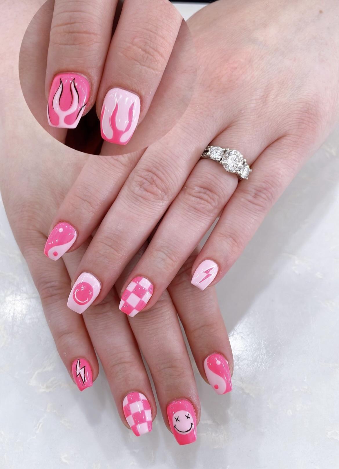 Wanted a fun vibe for a concert I’m going to this week! 💗 I don’t usually get a full design set but these were worth the splurge! Builder gel on natural nails. by fauxshaux