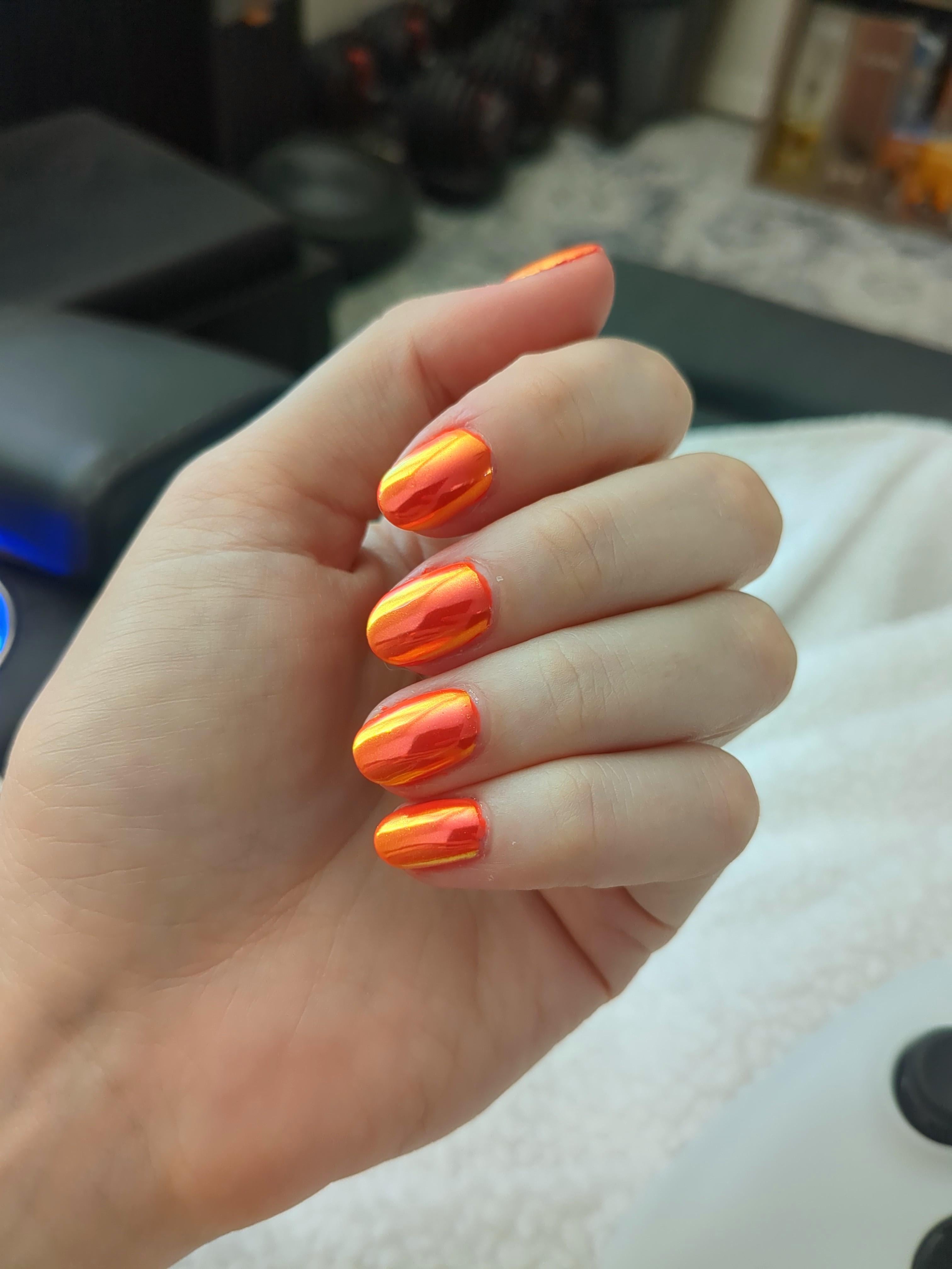 Photo for attention: OPI nail envy, ILNP turbocharged, gel top coat, hg professionals chrome powder in dragonfly 03, final layer of gel topcoat.
