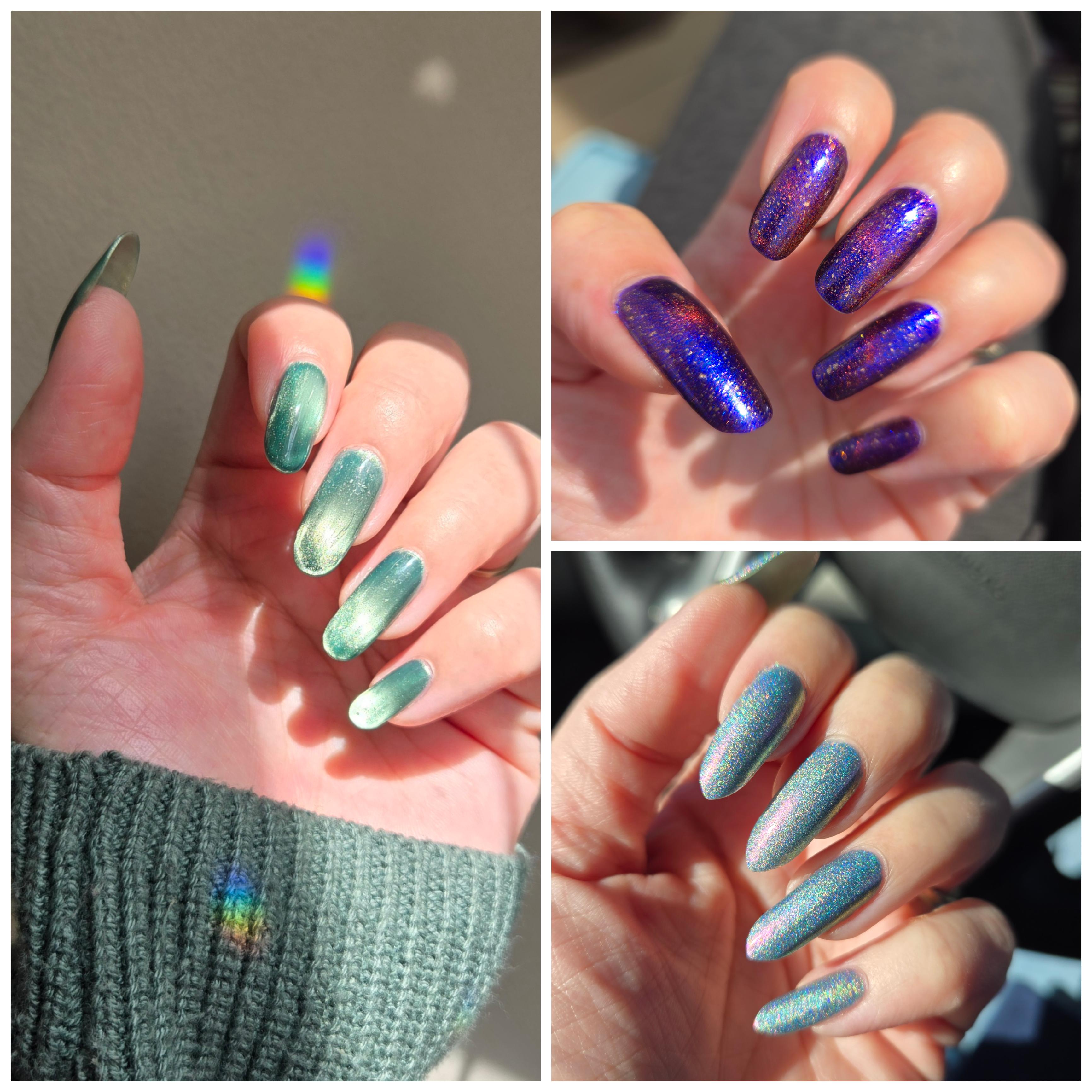 I'm wearing: BKL Bog Dweller (round), MC House of Hades topped with Nocturne (squoval) and Royla Lee Roadie Road Cat (pointy).