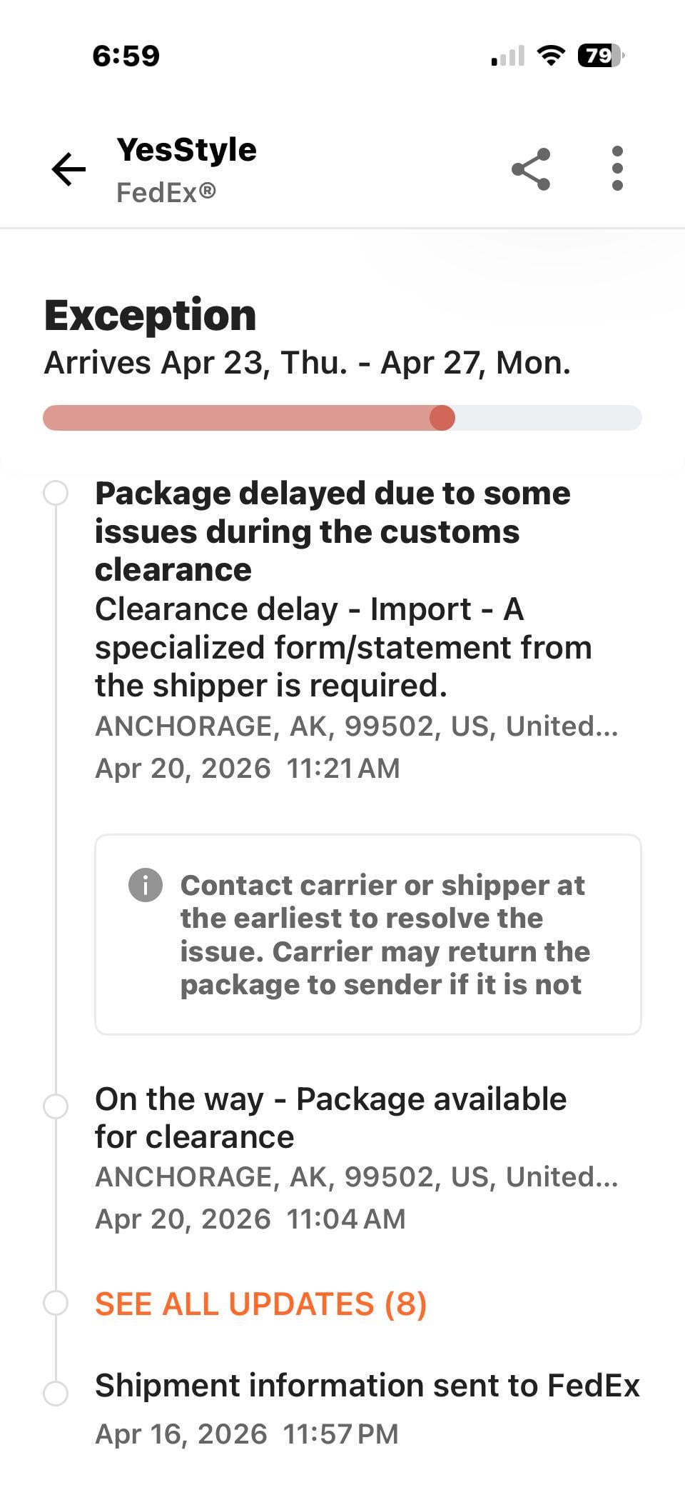 I had two packages hit customs in Alaska today. One cleared, and the other one got held up at customs. I received the following clearance exception on my AfterShip app below. I emailed YesStyle customer service twice but haven’t heard back yet except for some generic automatic email that they will get back to me as soon as they can. I also called FedEx and they were supposed to send me an email with some form that I’M supposed to fill out but I haven’t gotten anything yet. Anybody knows what this means? Both packages have sunscreen in them, but the package that was held was like all sunscreen versus the package that got cleared had one non sunscreen item too. I read on Reddit that the FDA is cracking down on sunscreens imported into the US because they have filters that the FDA doesn’t approve of. What is this form that they are asking for? Do I fill it out or does YesStyle fill it out? Thanks in advance for any information or help you can provide me. I really just want my sunscreens.