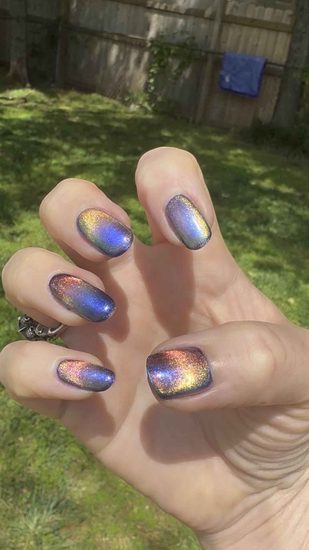 I started out having them all applied in thinnish vertical stripes with somewhat overlapping layers in a specific order. I did all (or most) of the left hand this way. Sheesh. That got old real quick. For someone with ADHD & Multiple Sclerosis, sitting for this long doing the same repetitious thing got old real quick. So the right hand, I was careless and reckless compared to the left. Whatever bottle I picked up first was it. It got smeared on (still vertically but it got laid down however big or small.) The next color was whatever I grabbed. I’d put that one beside and on top of the last one. By the time I was finished all were hella overlapped and topped each other. If I saw I had not enough of one color, I’d just add it to wherever as long as it’s on there. (If you look at my left pinky, it’s the only one that doesn’t lean predominantly yellow. It’s more on the red side & hardly any green/yellow. I used more scorchy and I was so done I didnt care to go back & adjust it).
