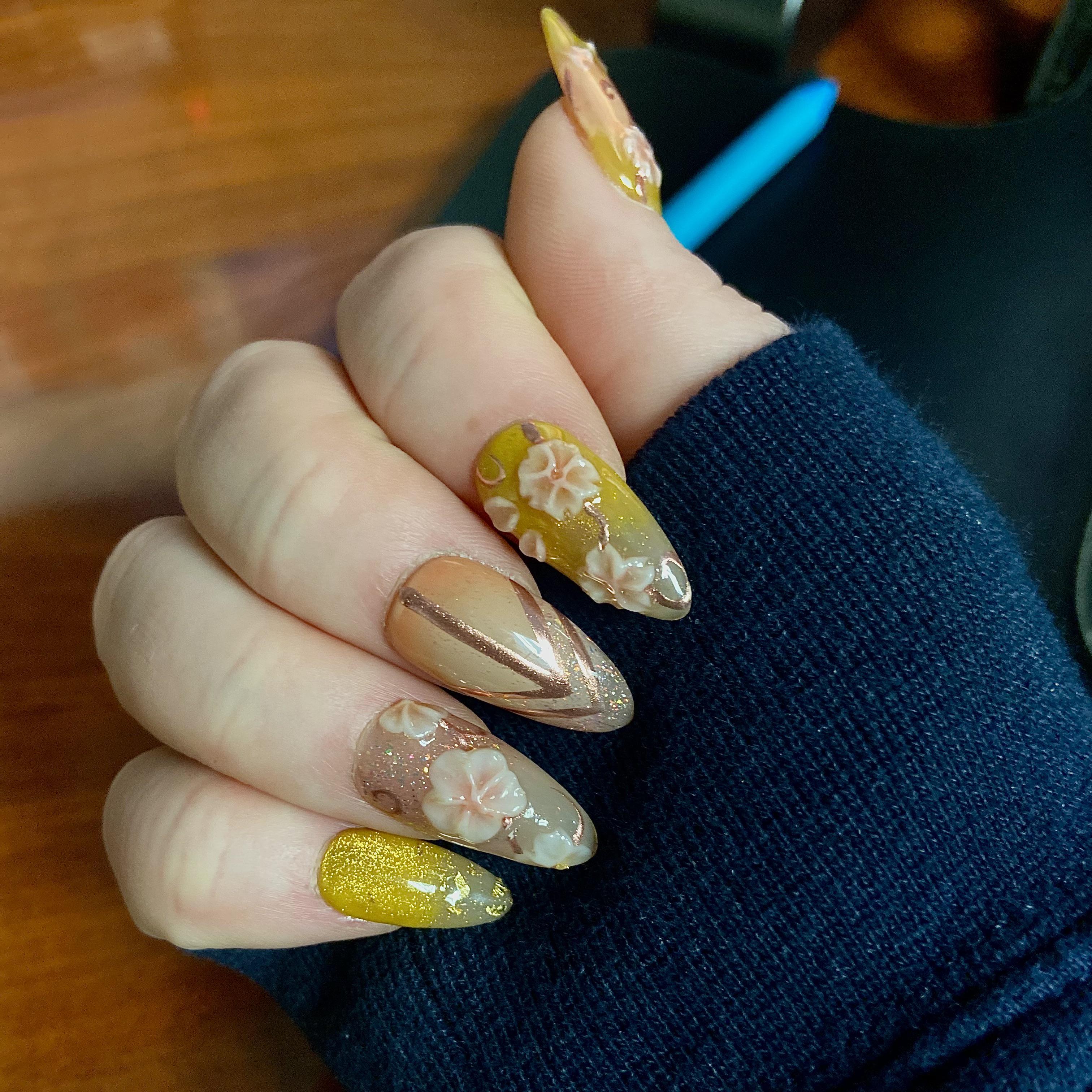 Share Facebook Twitter LinkedIn Pinterest Bluesky Threads Yellow/gold cat eye and a pink/peach blend. Rose gold chrome with gel flowers. I need a slower/stiffer 3D gel. The fight was no joke! by Wise-Assignment-3786