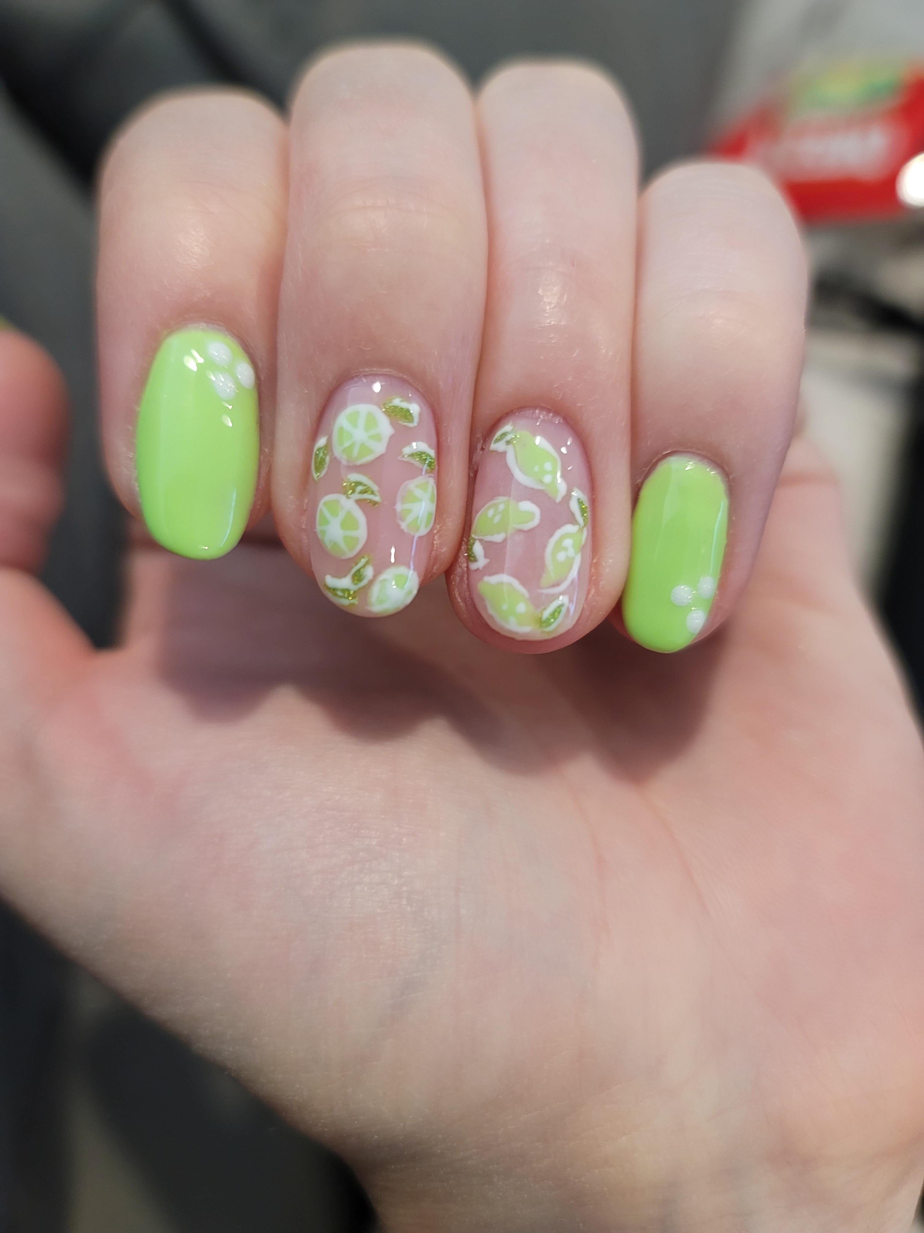 obsessed with the limes. what helped me with thin lines was switching to gel paint instead of regular polish, way easier to control