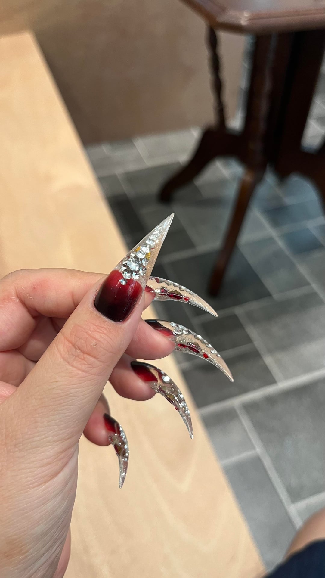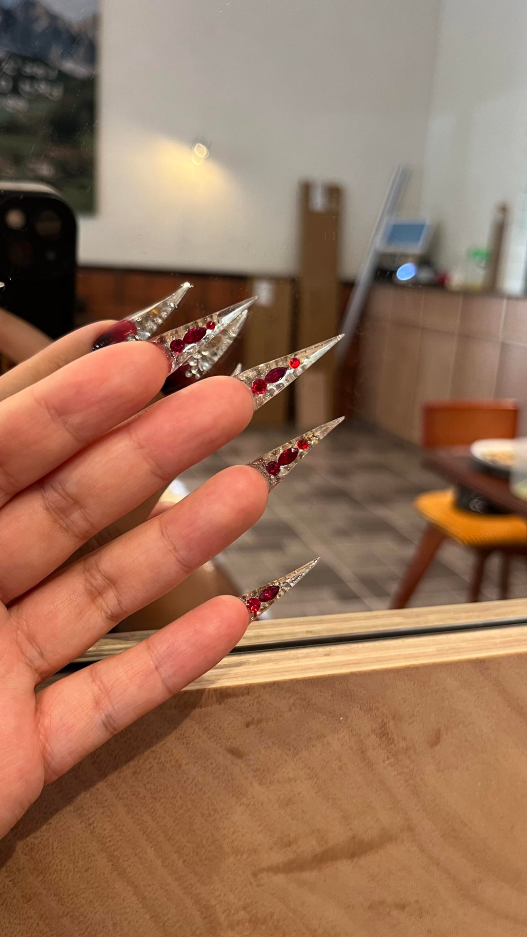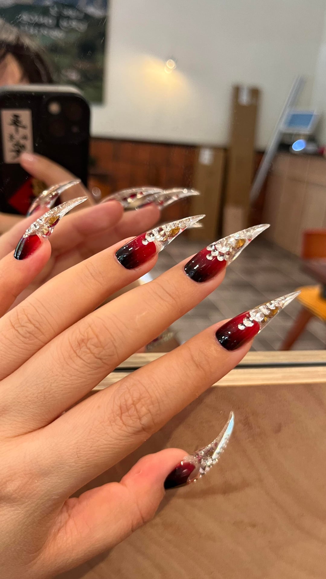 I made this very cool style. I made red and diamond on the dragon claw nail art.Does it look good?Do you like it?