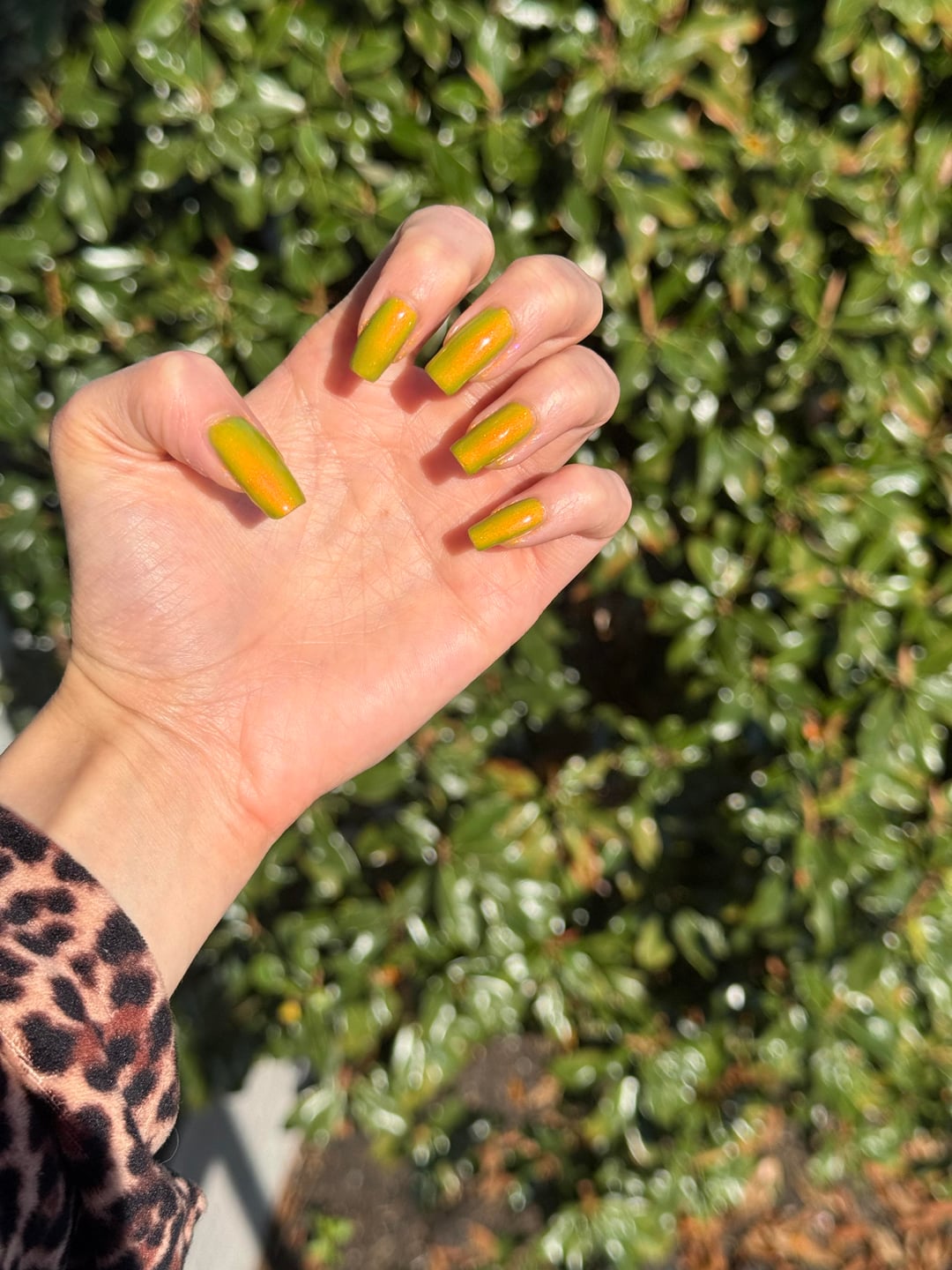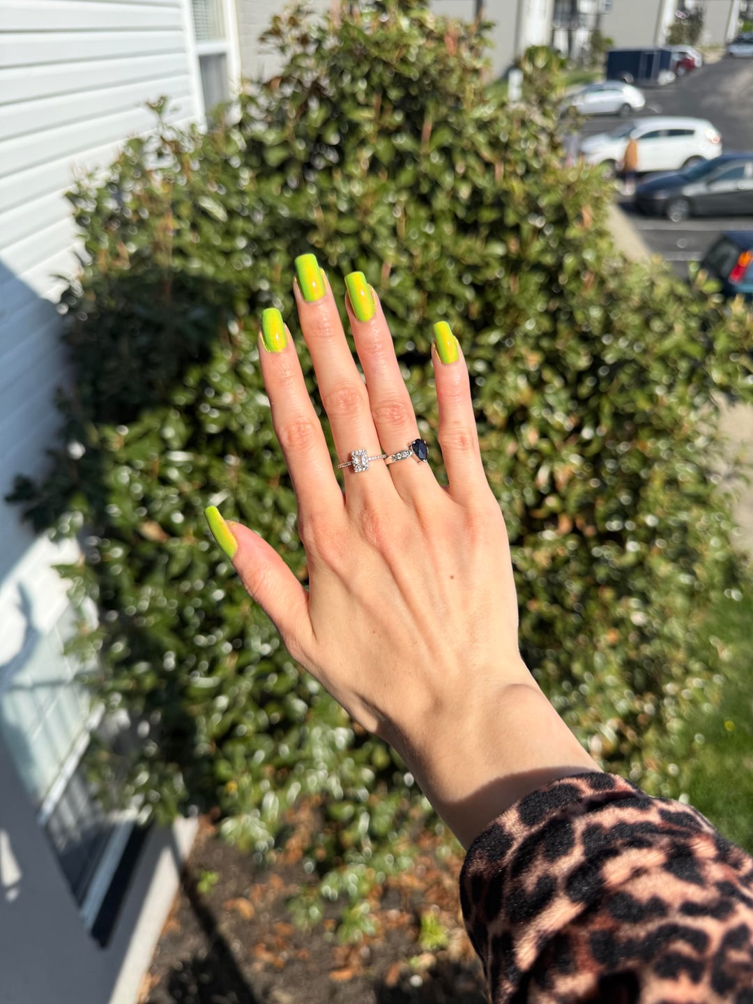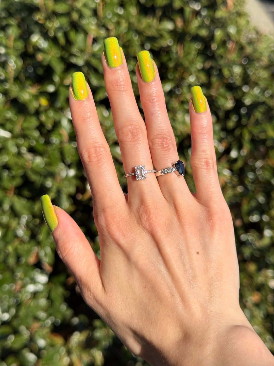 This is in three coats I will say it did apply a little sheerer than I anticipated- the shade built up to the neon color you see advertised but only in three coats so keep that in mind! That was the only thing I can say negative about it really. The formula is juicy and wonderful! But next time I do this mani Iβll make sure Iβm not in a hurry cause It did become trickier to apply neatly by the third coat- since it was trying to cure and I was in a hurry to go to sleep- I think next time Iβll layer it over a blurring base coat or a thin layer of polished for days UF glow so I donβt have to use three coats!