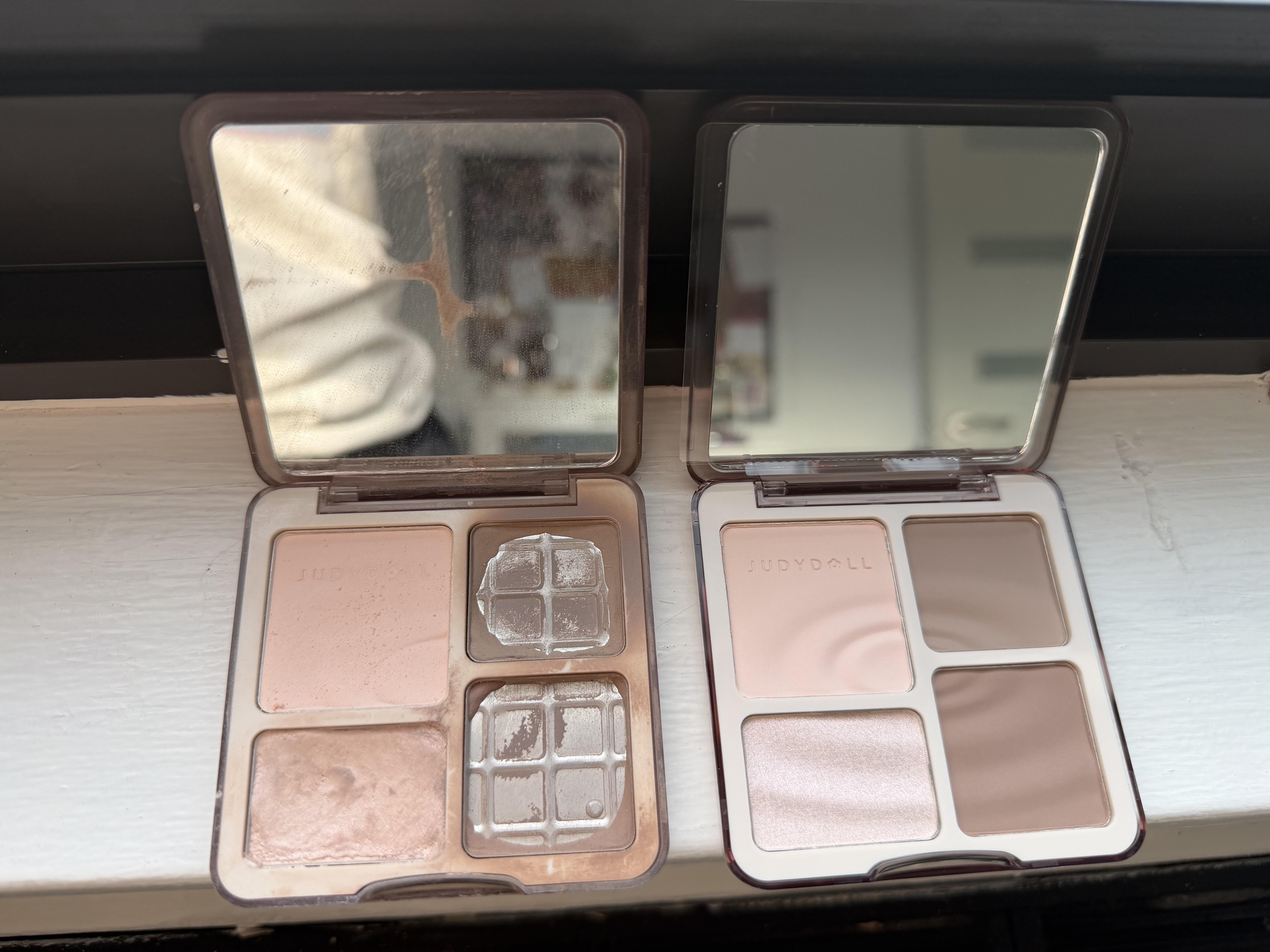 This is the judydoll powder contour palette in 01! I love it. It’s a perfect light cool toned contour for fair, neutral skin, and it’s so easy to blend. I didn’t make much of a dent in the brightening powder as I only started using it recently, but I can’t get even coverage with the old palette anymore, even digging my brush into the corners 😅. This product is a holy grail for me and something I use every time I wear makeup!