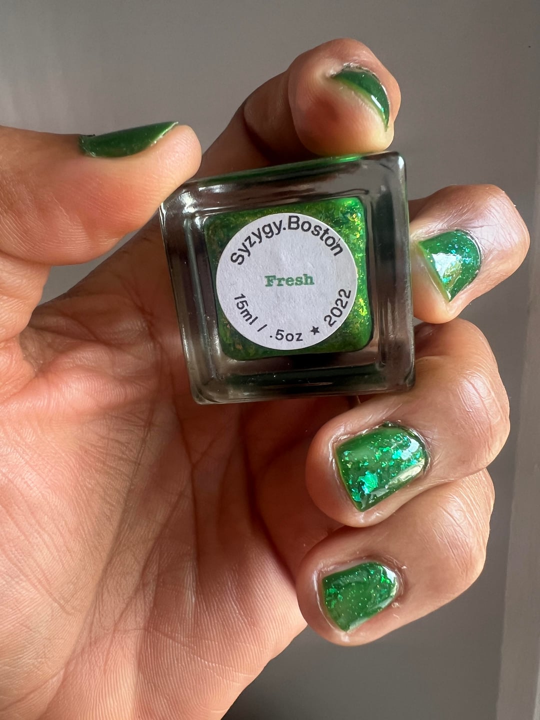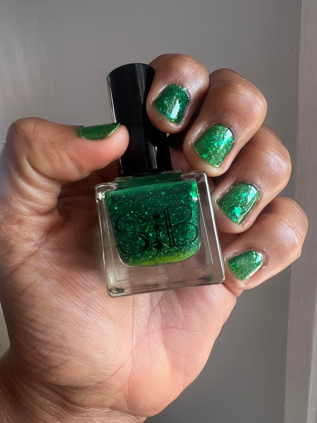 Fresh by Syzygy Boston (2022) is a bright green jelly with iridescent blue flakes. Shown here in two coats. I don’t really know this indie brand. I inherited it from a friend. Great for St Patrick’s Day 🍀 and Earth Day! 🌎 by curlycomedy