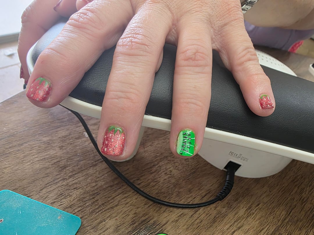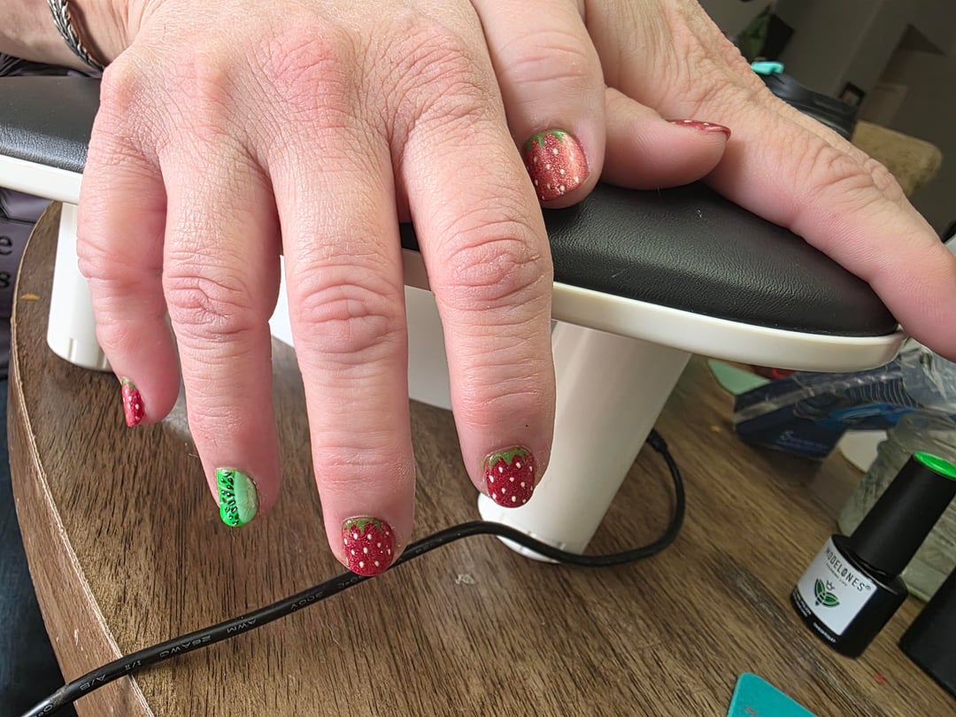 Did my mom's nails today! She requested the strawberries and kiwi accent nails.