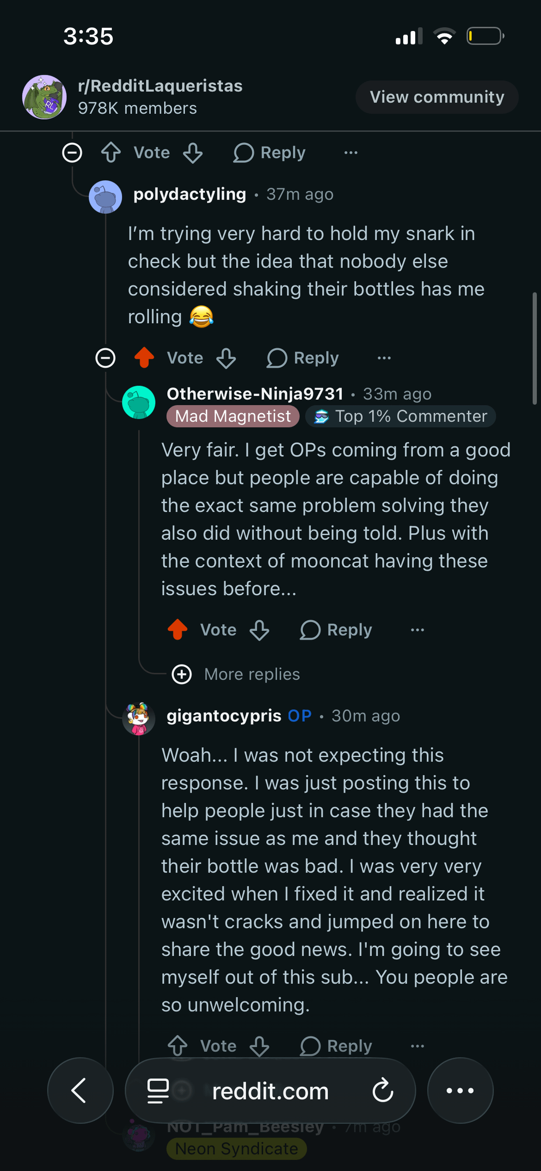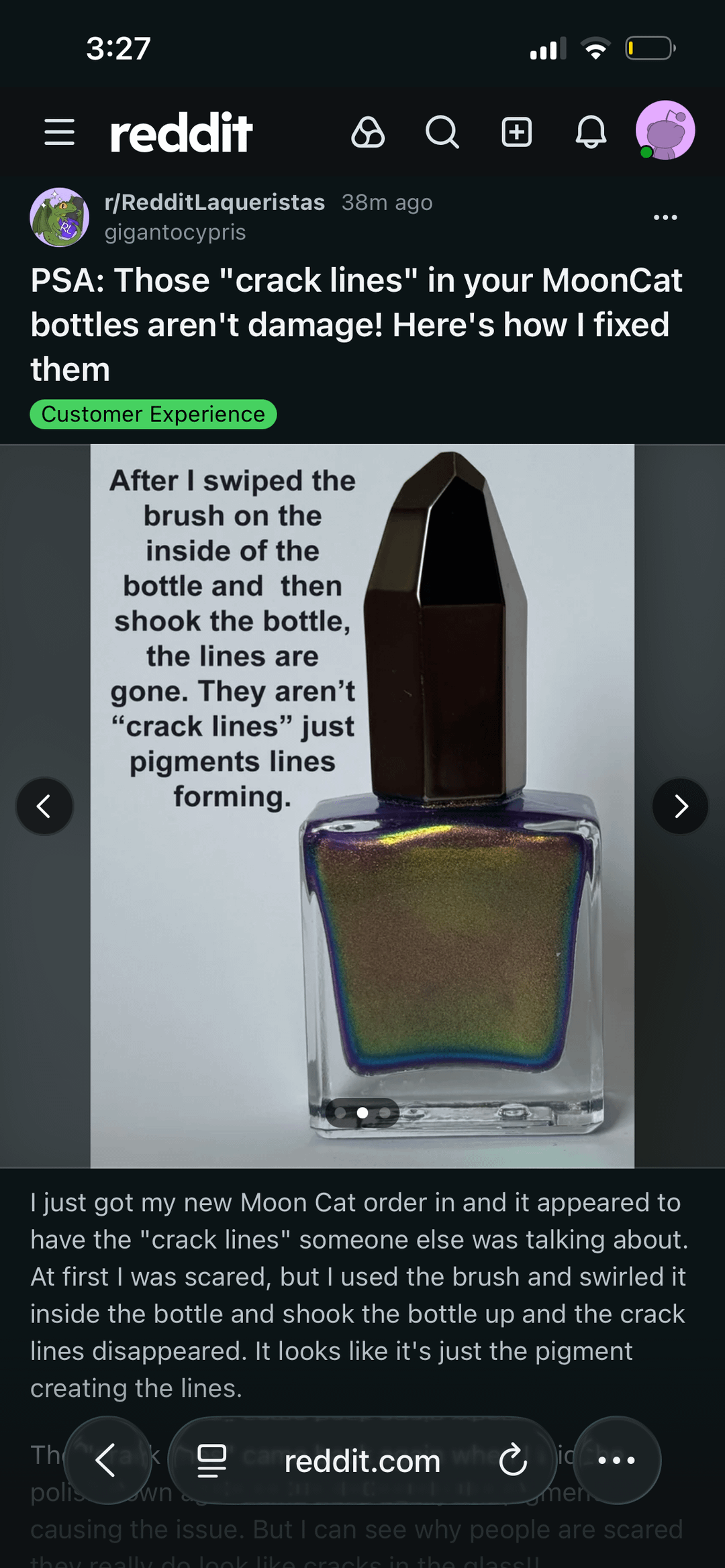 The first two pictures are from a post today (that has since been deleted) where the OP stated that what looks like cracks are actually not, it’s just pigment. When someone pointed out that it’s strange to assume none of these people who have cracked bottles would have shook the bottles to make sure it’s not just pigment, the OP responded (this is the second pic) in a really defensive and guilty trippy way. the tone of that response made me suspicious so I did a little research, and it looks like the OP is potentially a mooncat employee (Proof is the second two pics). Just sharing for anyone who cares about this info. Links to the posts I’m referring to are in my profile.