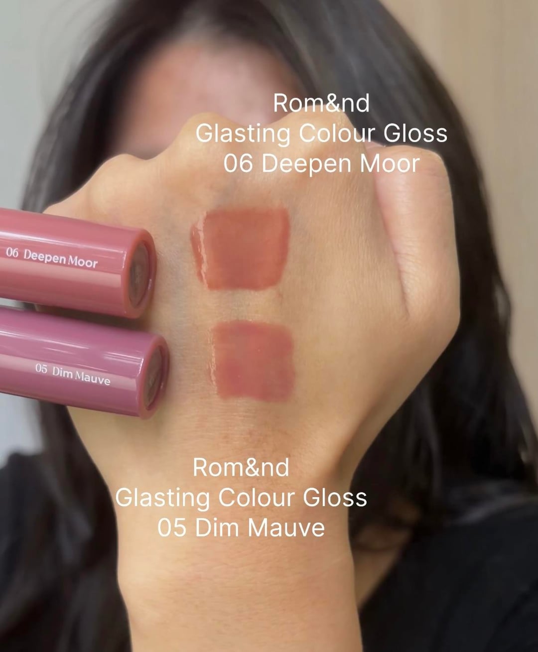 Hey y’all, today I compared Rom&nd Glasting Colour Gloss in 05 Dim Mauve and 06 Deepen Moor on my light medium warm skin tone.