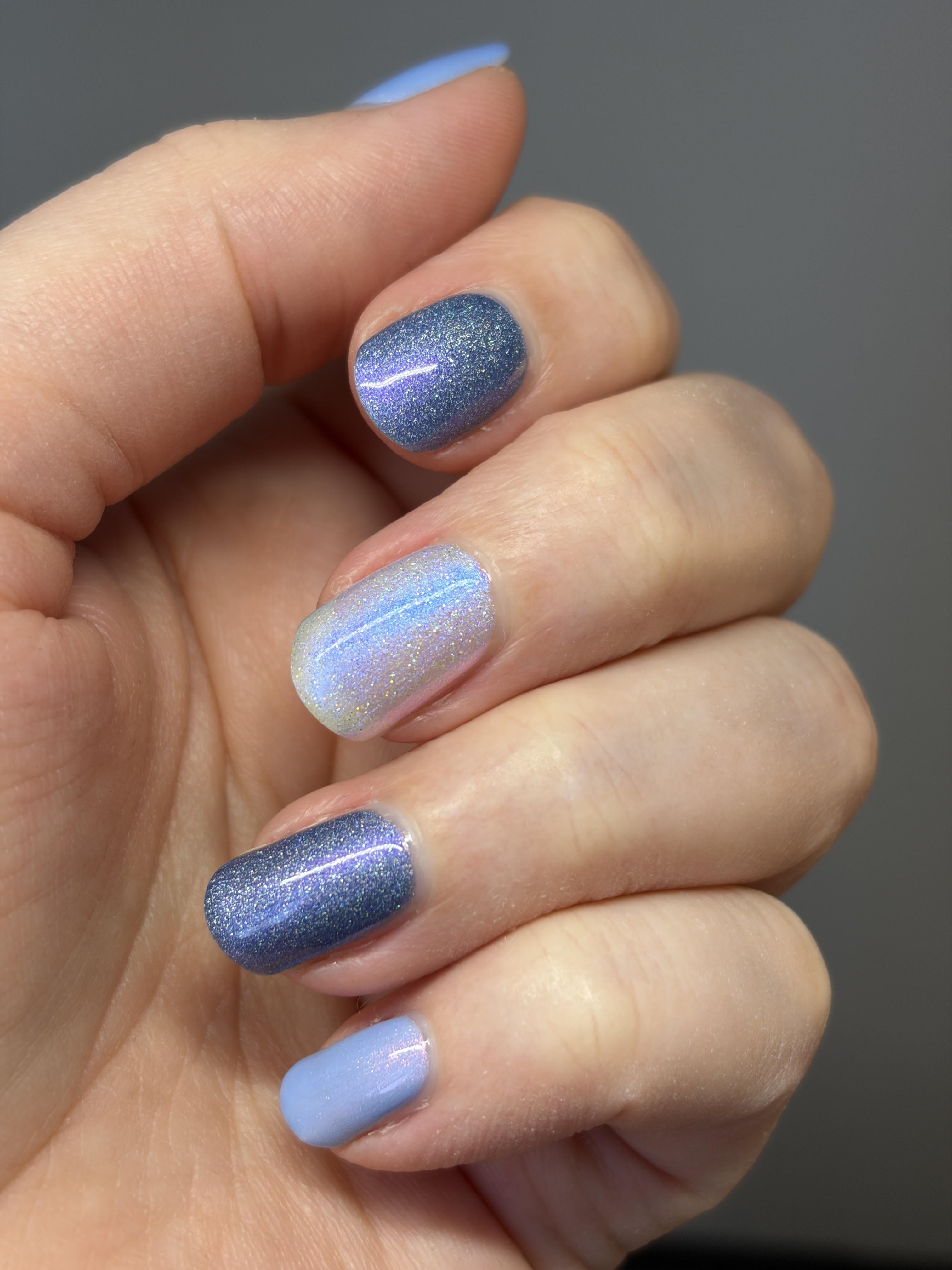 Nailtiques formula 2, KBShimmer Stay Put Hydrating base coat, Holo Taco ‘Vitamin Glow’ (thumb & pinky), Mooncat ‘Abominable’ (index & ring), Mooncat ‘Ghost of Hecate’ (middle), Cuticula Limitless QDTC.