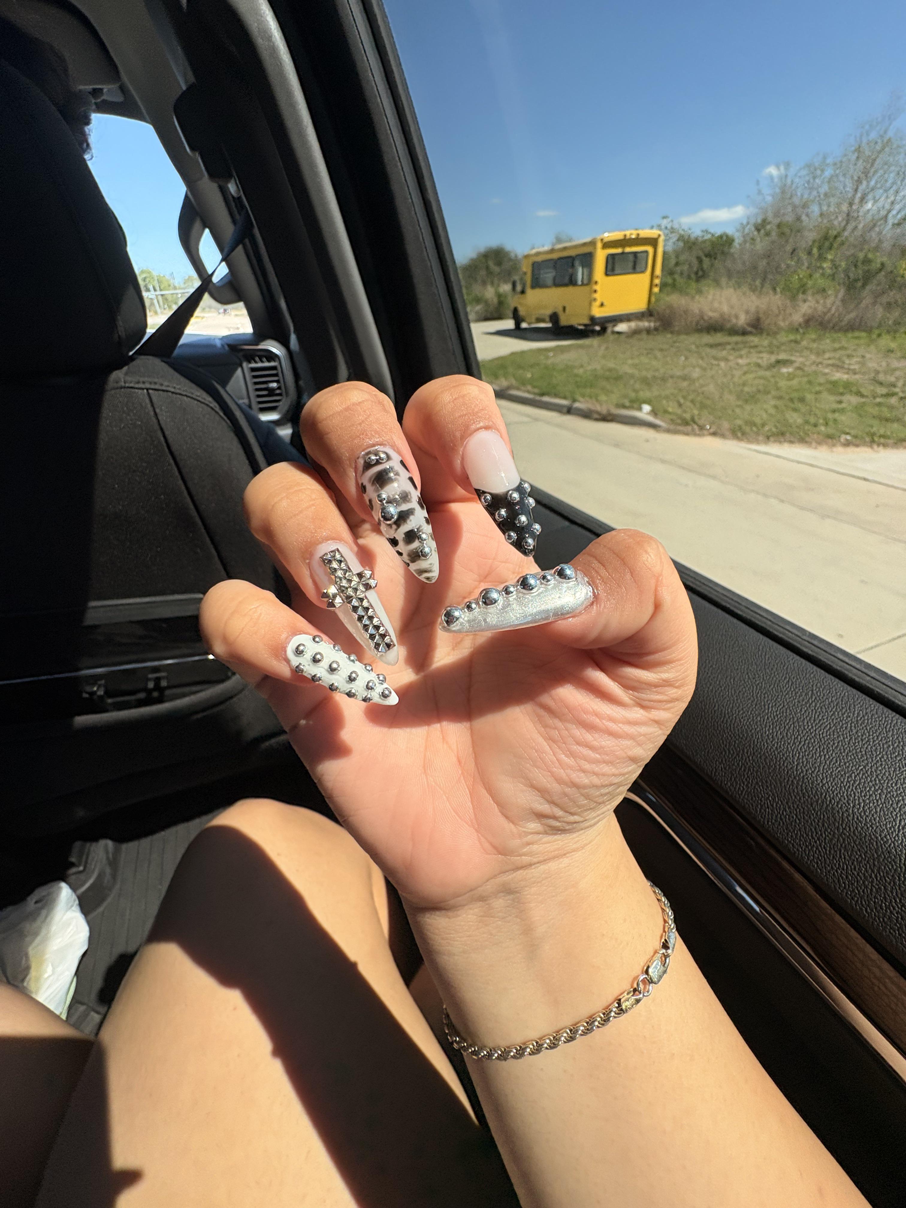 Dude those rhinestones are wild – definitely not something I’d see on a jobsite but I can appreciate the craftsmanship. My sister’s always doing crazy nail art like this and the amount of patience it takes is insane. I can barely manage to paint a wall straight let alone place all those tiny gems perfectly. The silver and clear combo looks pretty clean too, gives off that whole icy vibe. How long did those take you to do because that level of detail looks like it would take forever