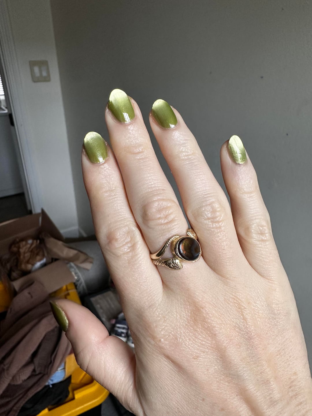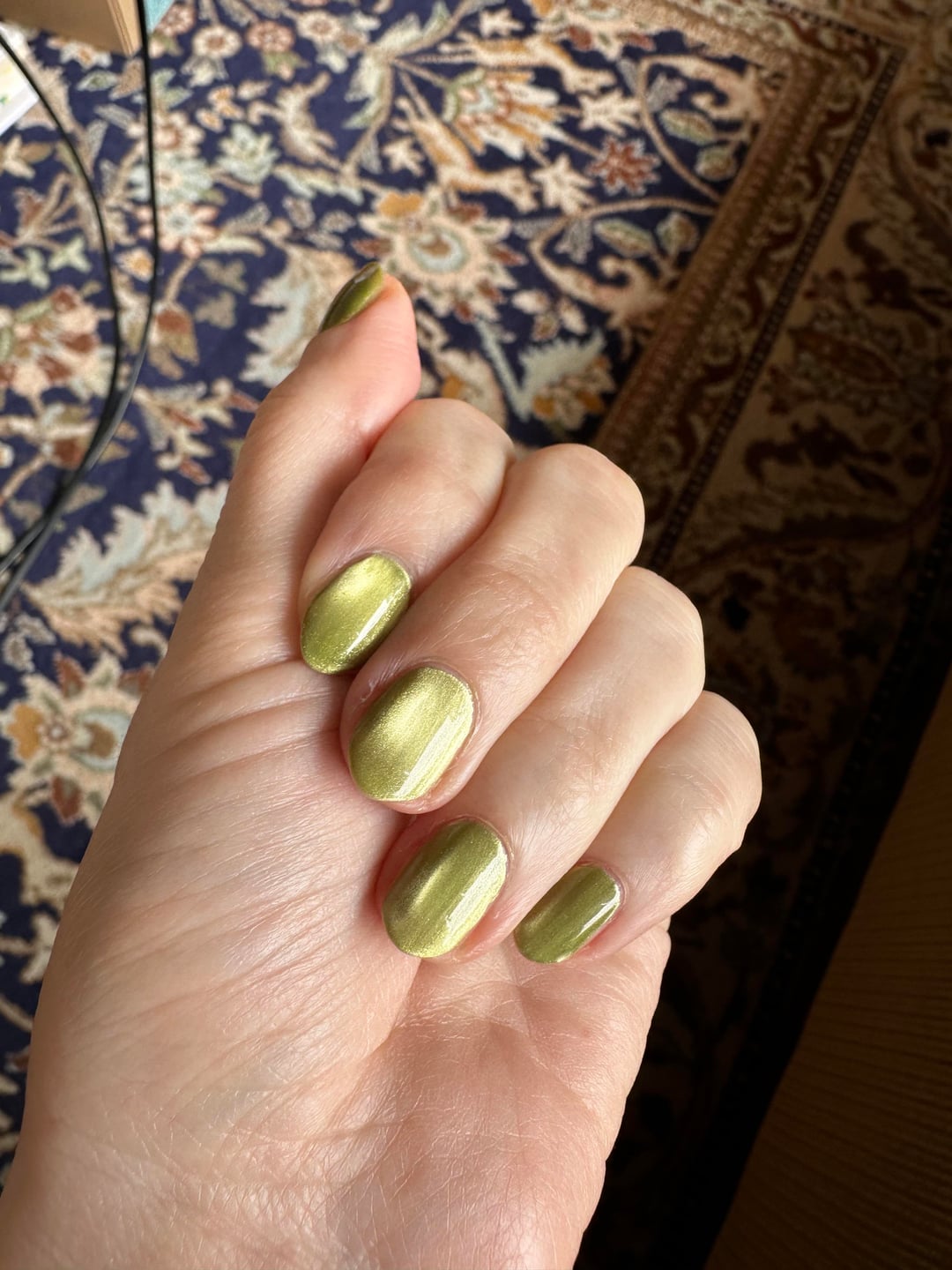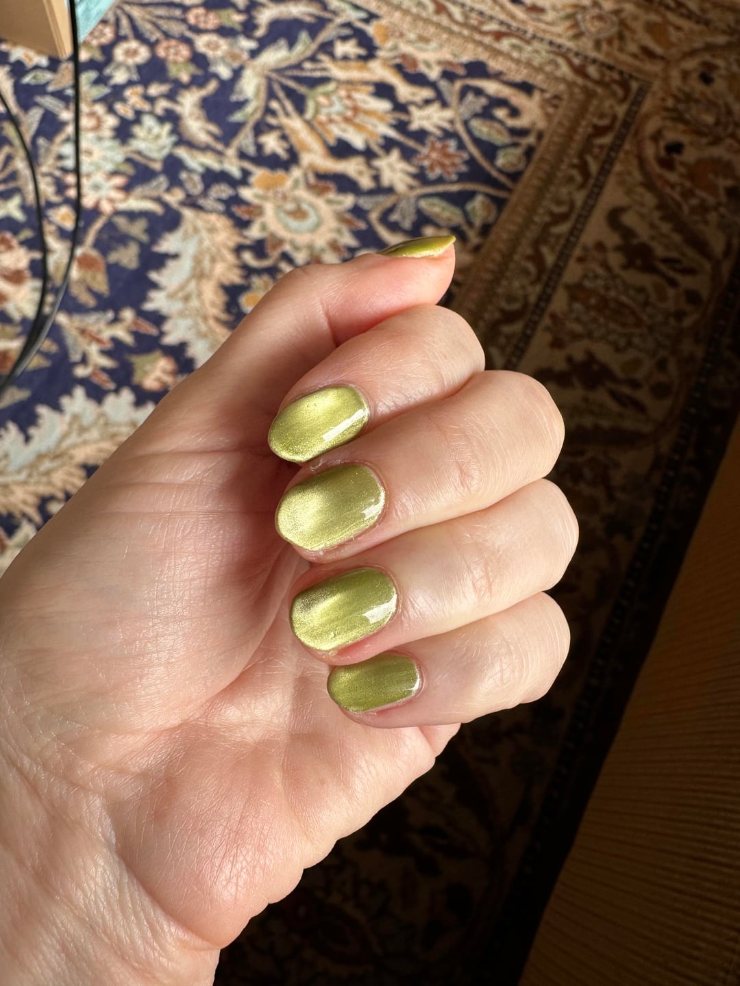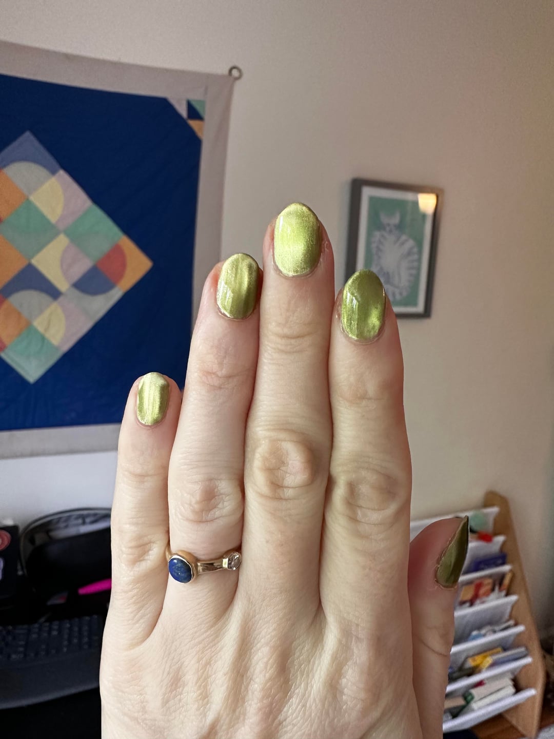 laissez-fire on April 25, 2026 9:23 pm KBShimmer Fillin’ Groovy 1x BKL Touch Moss unmagnetized 1x BKL Touch Moss magnetized in glass bead style using 5D Spinner with 30lb horseshoe on top Cuticula QDTC