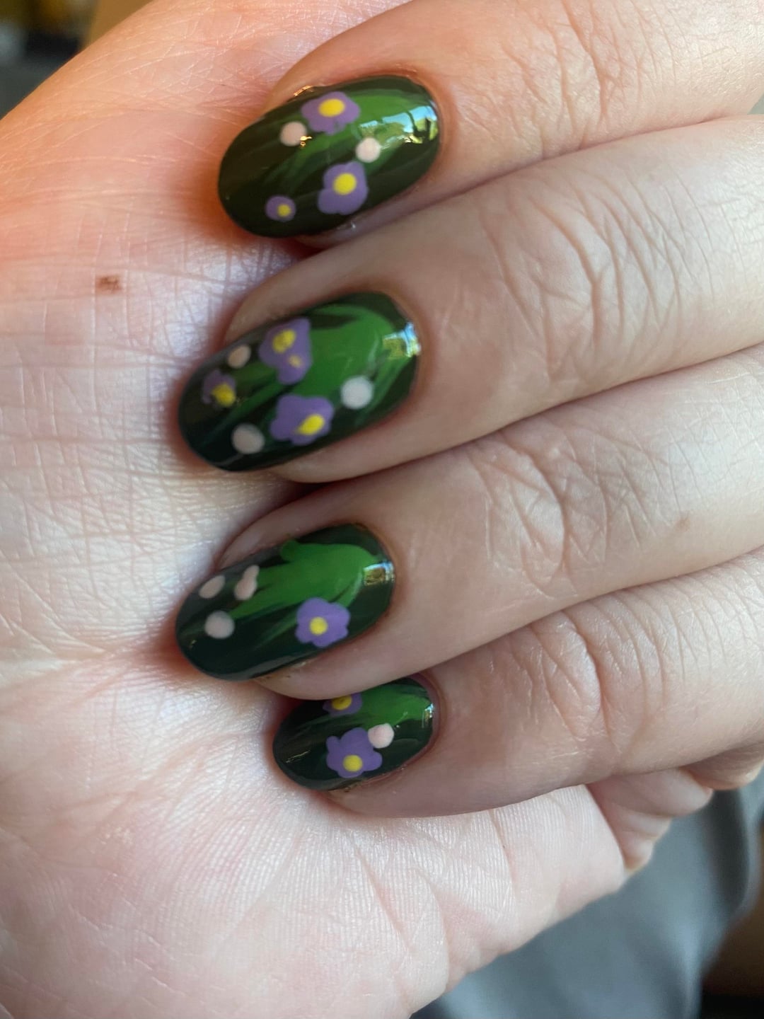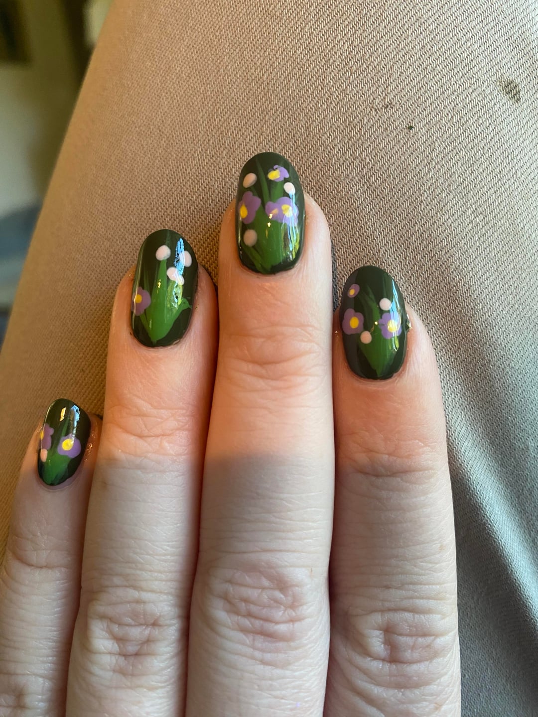 1. I’d have either gone with a lighter background or darker colors for the flowers. Maybe small tools/brushes for them. But I really like it it’s cute! And maybe next time just a couple accent nails or different designs/variations like some nails just black and green and one or two nails just one flower with no grass. But that’s personal preference. I’ve been a beginner for a long time lol and I’m still shaky with doing the designs on myself and not press ons.