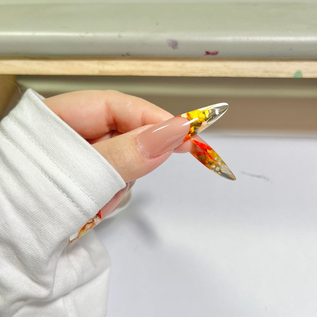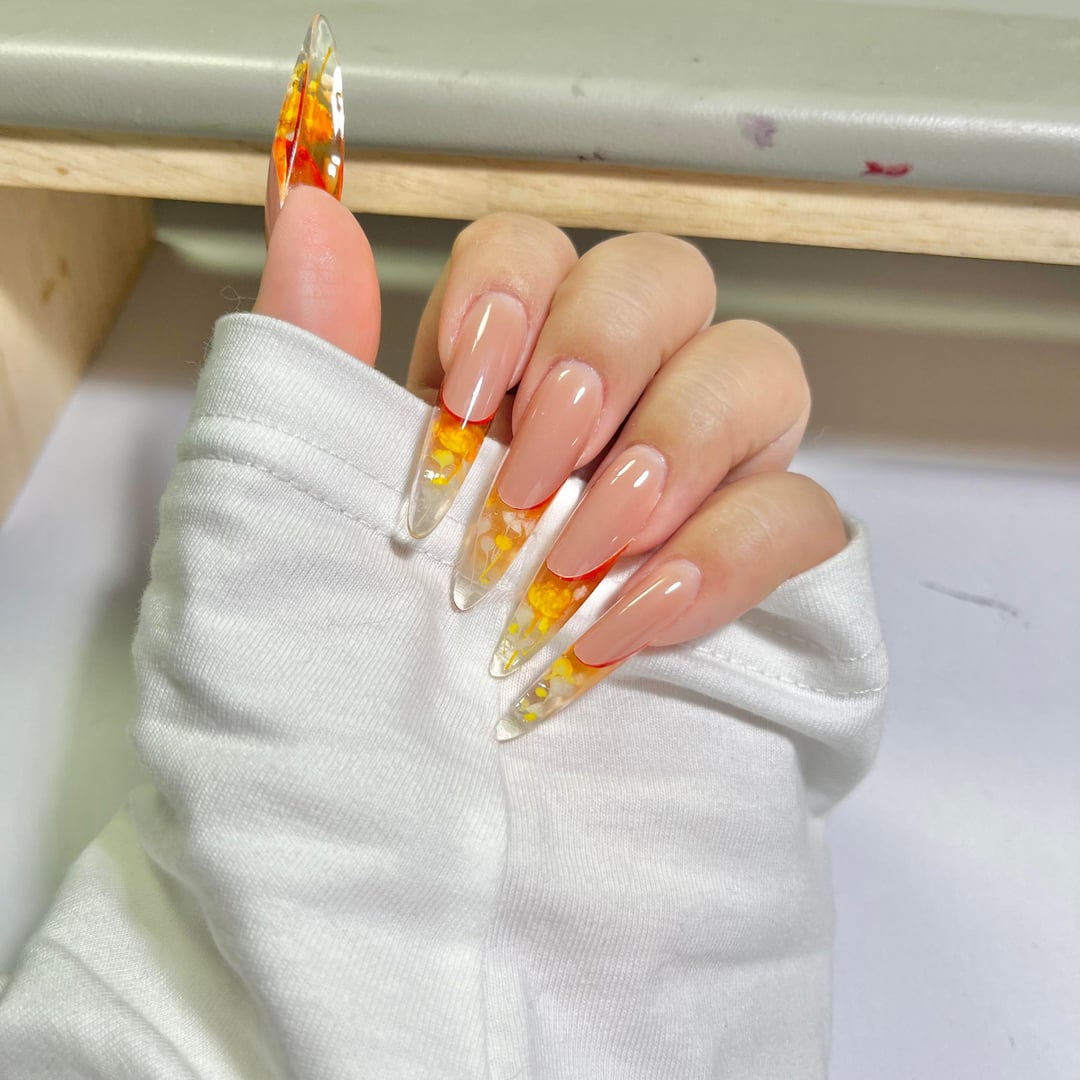 Does this nail shape look good?I put a small flower at my fingertips,which is as beautiful as growing on my nails.What do you think?