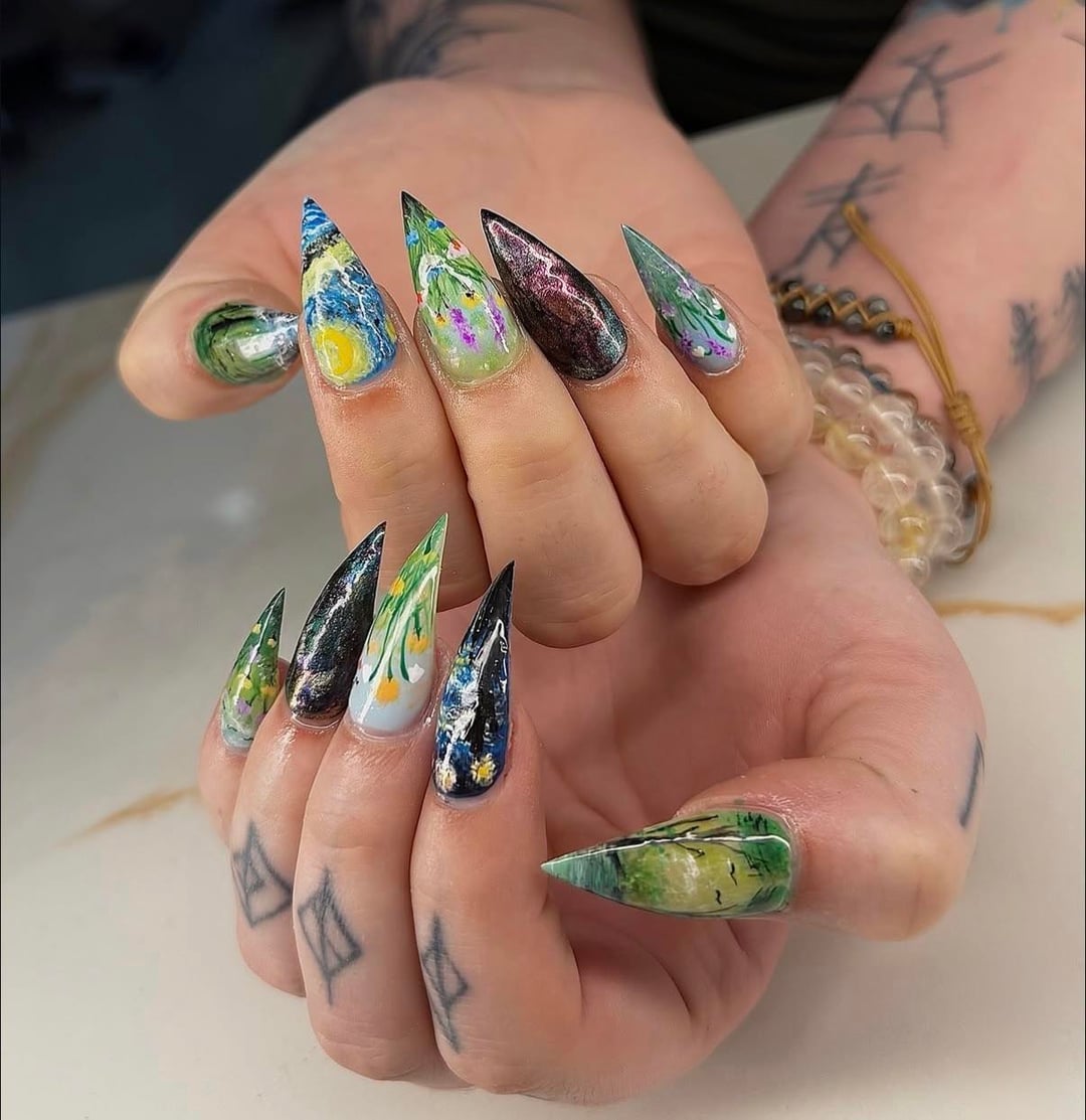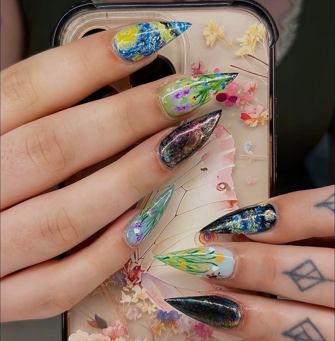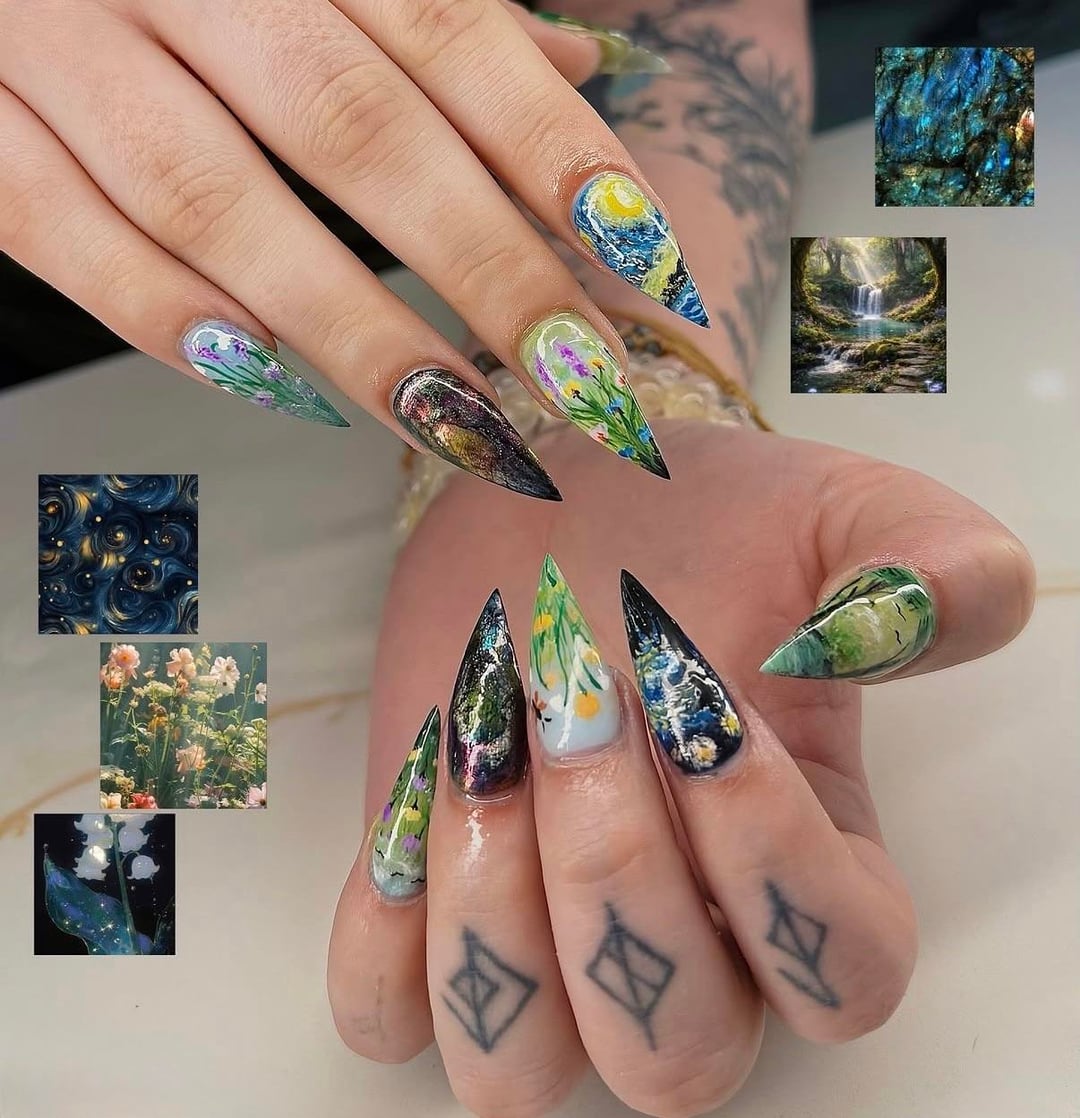 My birthday nails, mixing in everything I love from art to nature to starry nights and crystals (labradorite is my favorite) 🥹🥰 by Ok-Hedgehog3988