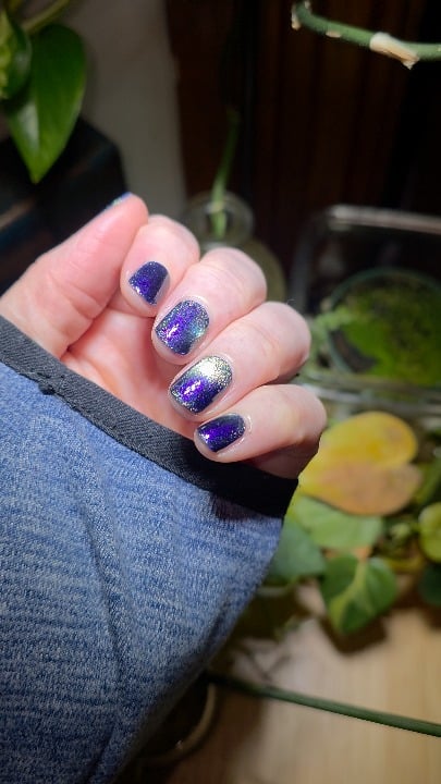Loving this purple despite being very out of season! This is two beautiful coats of Jumping Spider Surprise from Cracked 💜🩶💜 KB Shimmer Fillin Groovy Base and KB Shimmer QD topcoat clearly on top. Magnetized using a lab fish magnetic stirrer, just holding my finger upside down over the crosshairs for like 30 seconds each coat and one full minute for topcoat!