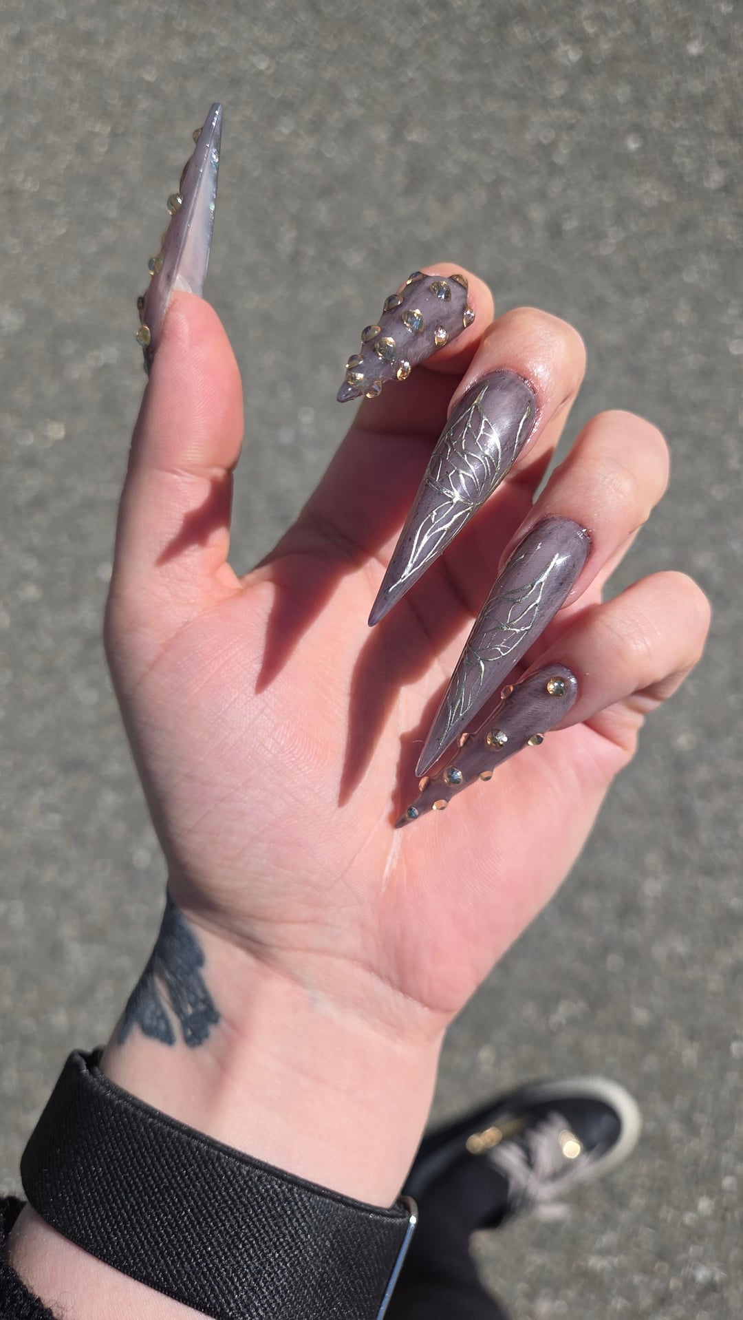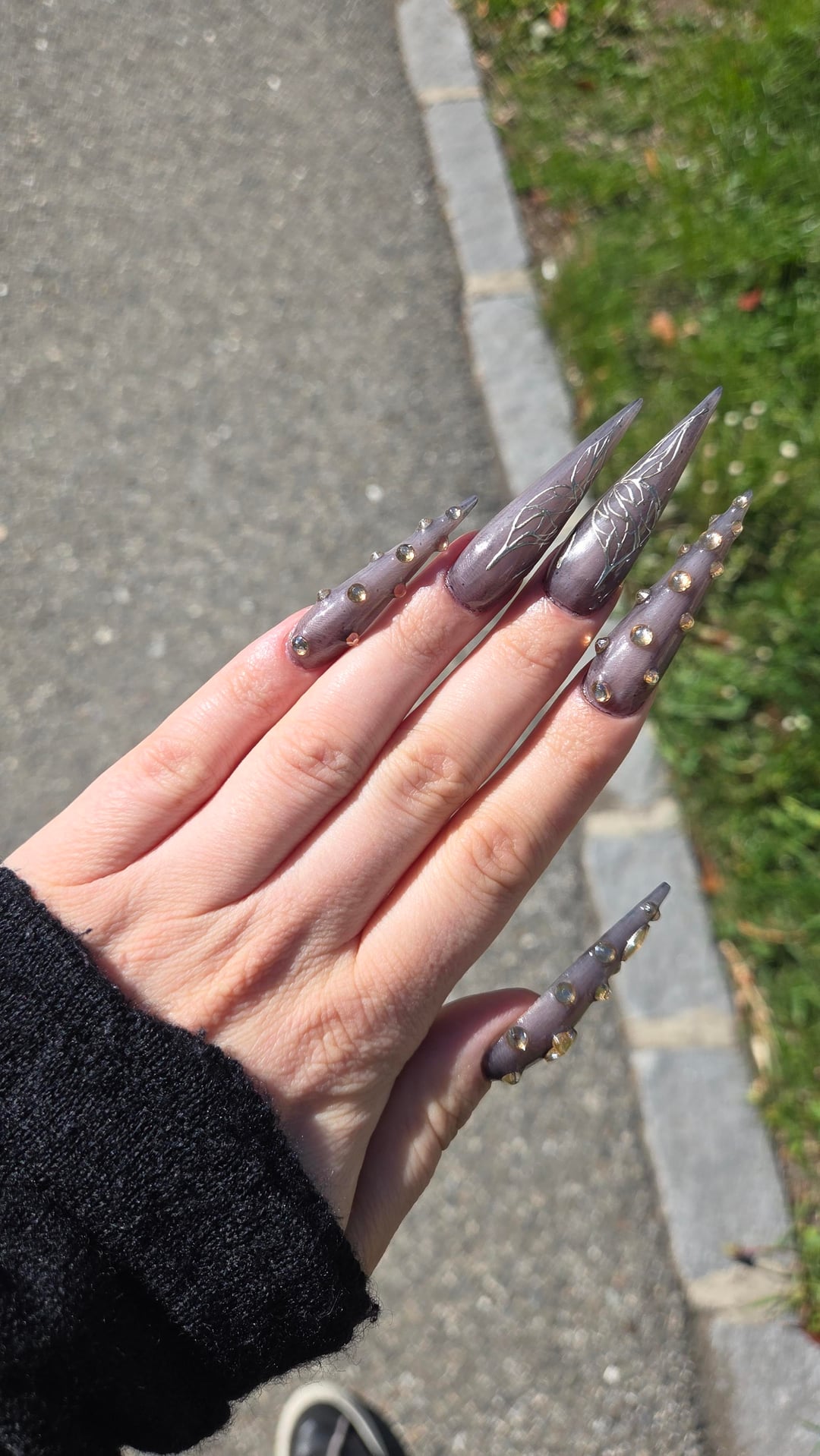 I'm so in love with my new dark fairy nails. The shape, the gems, the smoky shimmer — everything is perfect, but the butterflies are definitely my favorite detail. My nail fairy absolutely killed it, she’s the best and I’m obsessed.