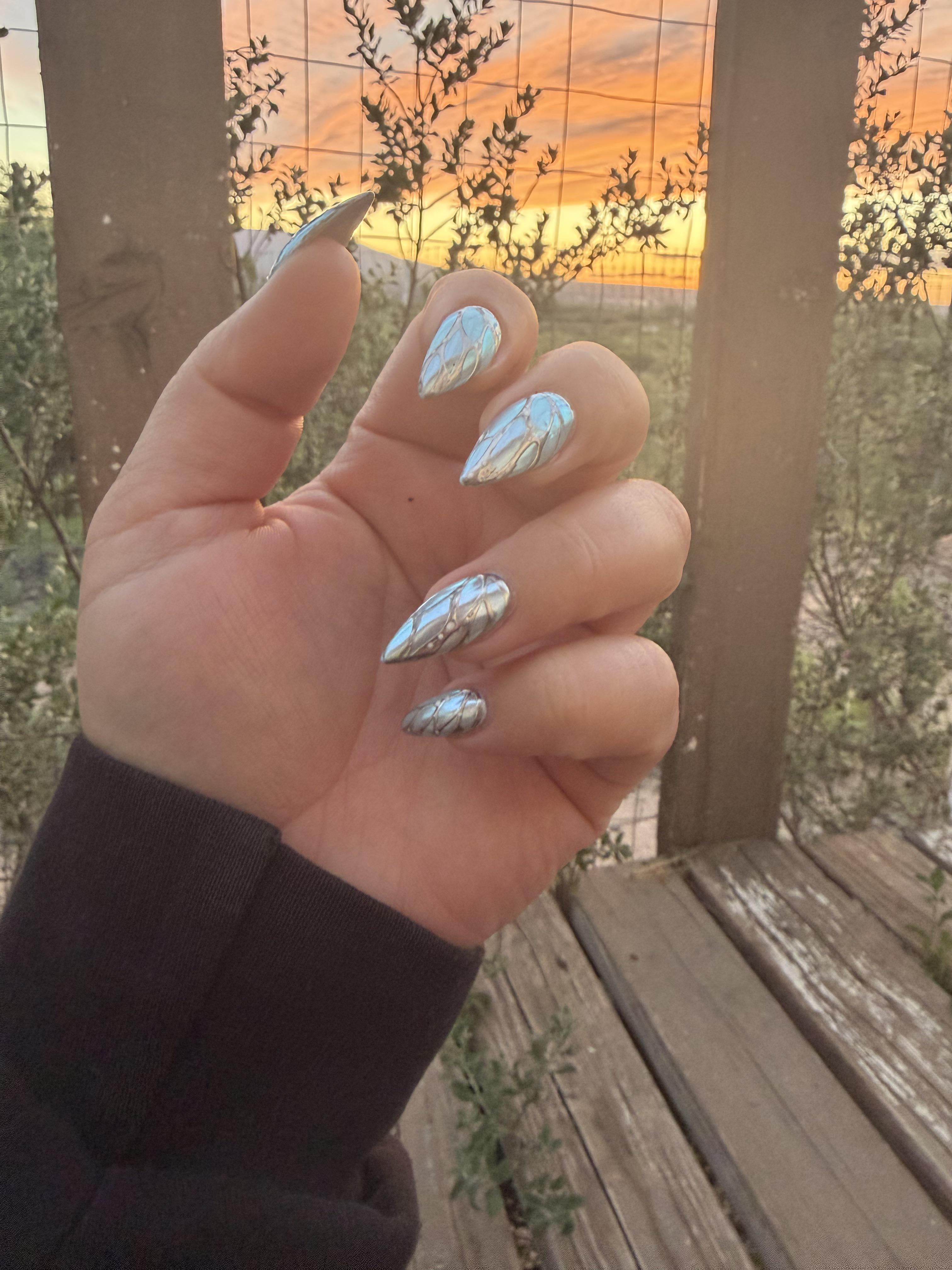 Share Facebook Twitter LinkedIn Pinterest Bluesky Threads I asked for a mostly blue set and I wanted fairy wings. I think she rocked it. She used a mermaid chrome over the blue and painted on the silver using a fine liner. by BlackCollarBelle