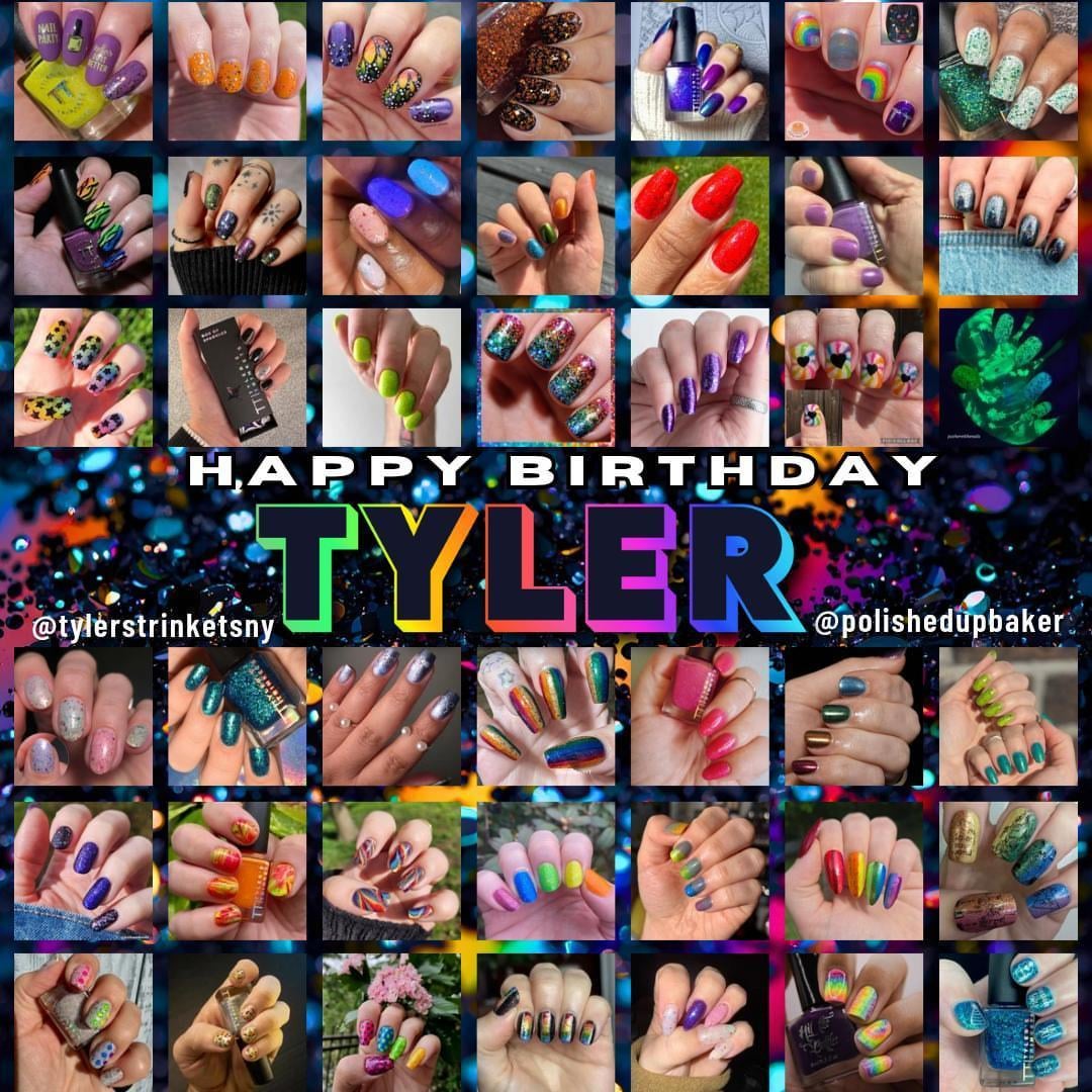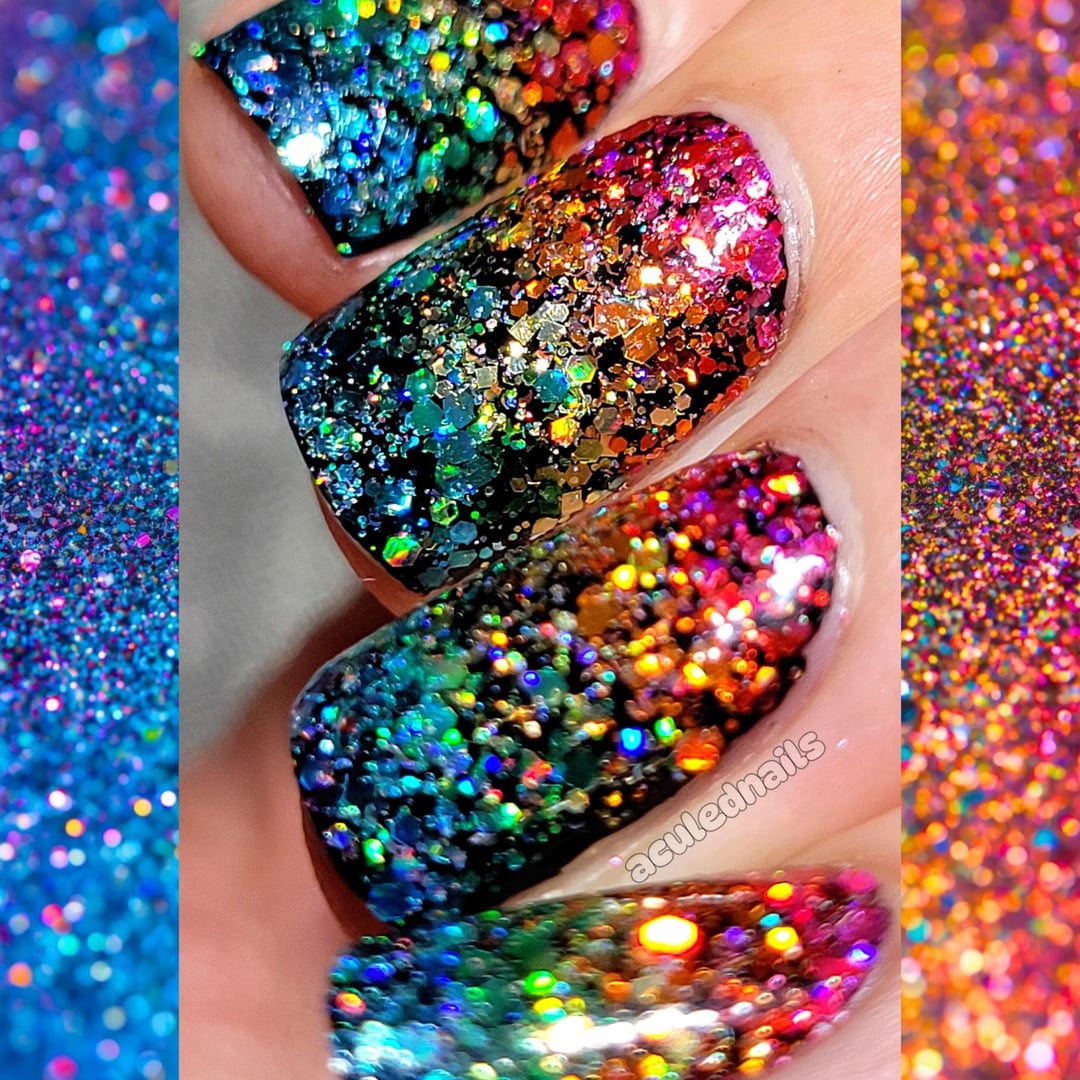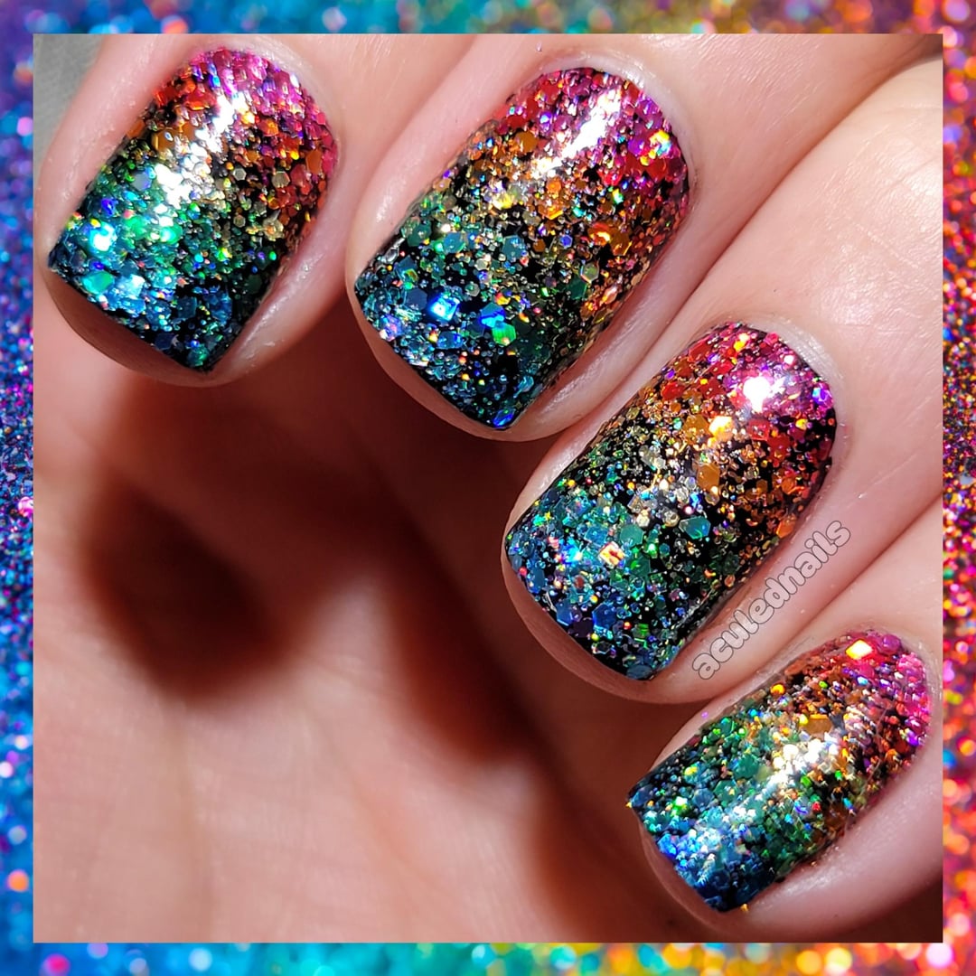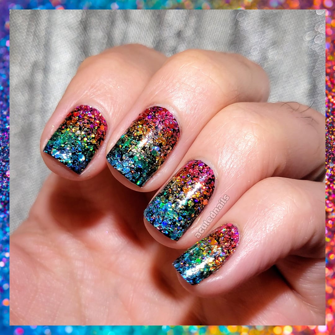It's Tyler's Trinkets Birthday! What can I say about Tyler… he's an absolute powerhouse business owner, polish maker, creative mind, sassy beyotch, and a great friend.ย ๐ซถย What does one paint for such a gay? Rainbows, duh. ๐ย What rainbows though? Glitter,ย duh. โจ๏ธ When we were designing my rainbow glitter topper, this boy was covered in it like a miner. If he wasn't so responsible and wore PPE, I would have probably given him glitter lung. I've done a vertical glitter gradient using his pride toppers before, but this time I decided to hate myself for the love of Tyler, and pack this shit horizonal for my boo. A little mix of sponging it on for coverage, and adding some with a brush, we got this sparkling shield gradient of rainbow glitter that I am obsessed with. My phone camera doesn't even pick up all the sparkles because it gets overloaded haha. Nothing I could give would bring him more joy on his birthday, than me having to clean this shit up ๐๐โจ๏ธ๐ซ