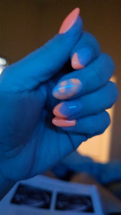This is my first time trying blooming gel and French tip. I'm dominant right handed. Forgive the light, it makes the color and blooming gel nail pop out more.