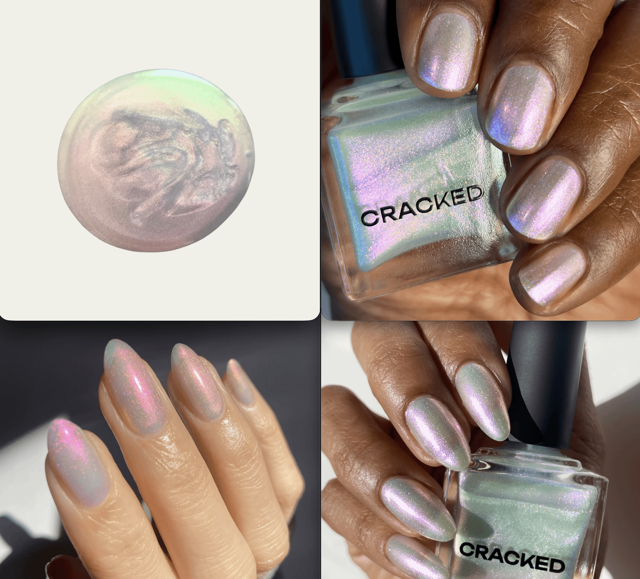 Will your outfit be white or another light neutral color? The purply pink and green tones will look more noticeable in photos when compared to a white outfit for example. They are beautiful shades and great picks, just something to consider. If you want ethereal but more subtle, a white chrome topper like the other commenter mentioned would work, or a silver- or champagne-toned magnetic! Fancy Gloss has a new silver magnetic topper and Jen & Berries and a champagne toned magnetic topper you can put over any color nails.