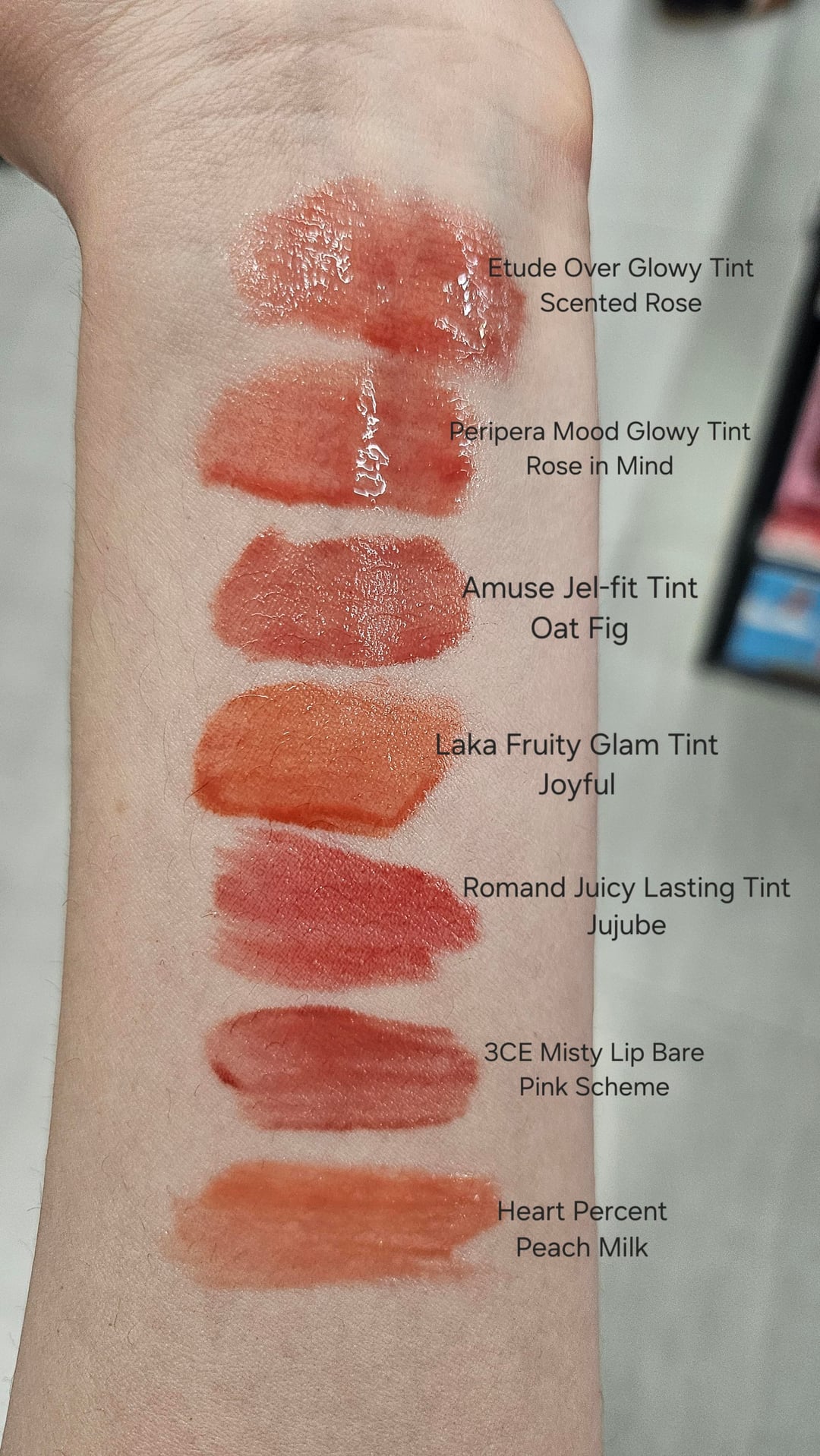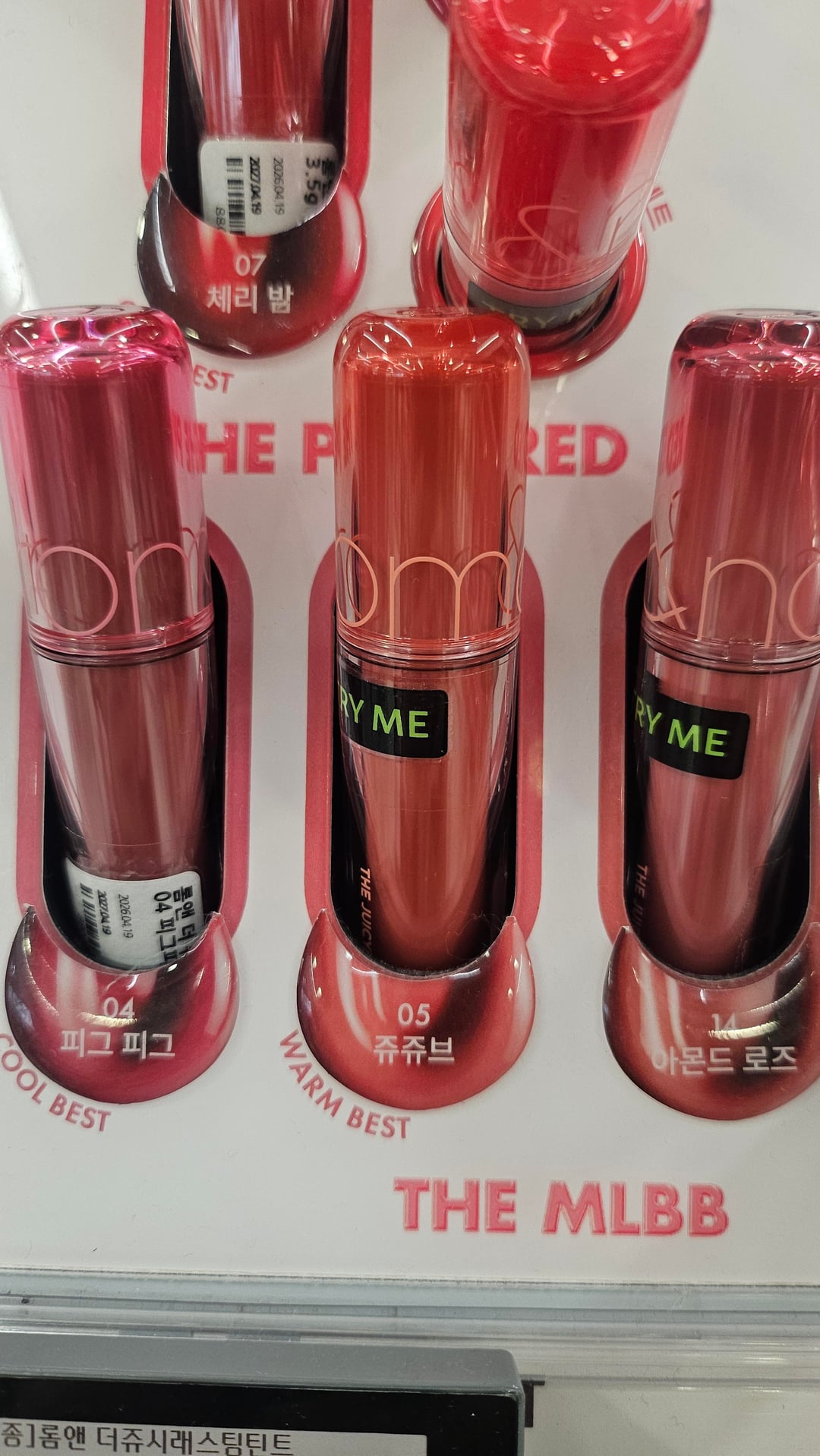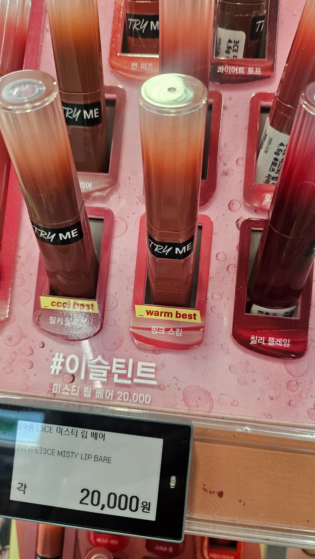 A compilation of the warm best lip tints in Olive Young plus residual stains. I picked up the tints that were recommended on the displays and was surprised to find that they were all somewhat similar shades (though the packaging colors varied greatly)