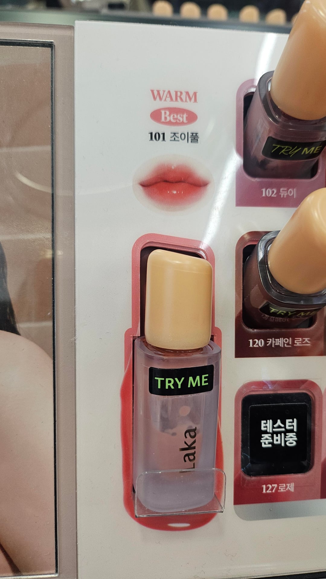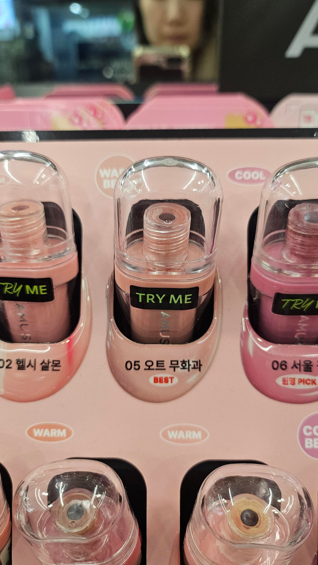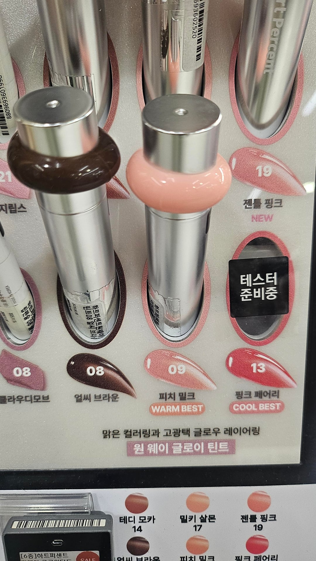 A compilation of the warm best lip tints in Olive Young plus residual stains. I picked up the tints that were recommended on the displays and was surprised to find that they were all somewhat similar shades (though the packaging colors varied greatly)