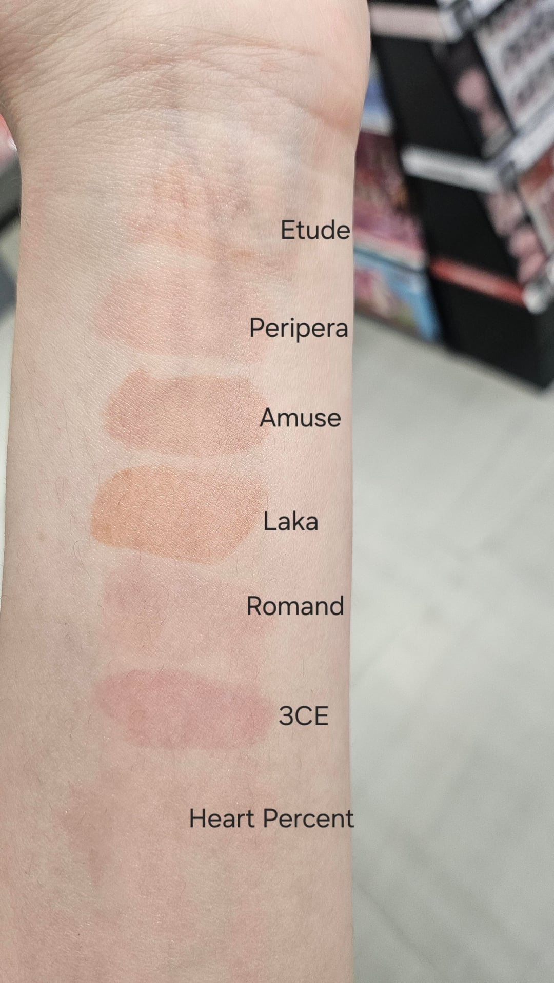 Among these, both Amuse and Laka were the most lightweight formulas while leaving the strongest stain. Etude and Heart Percent did not leave much of a stain.
