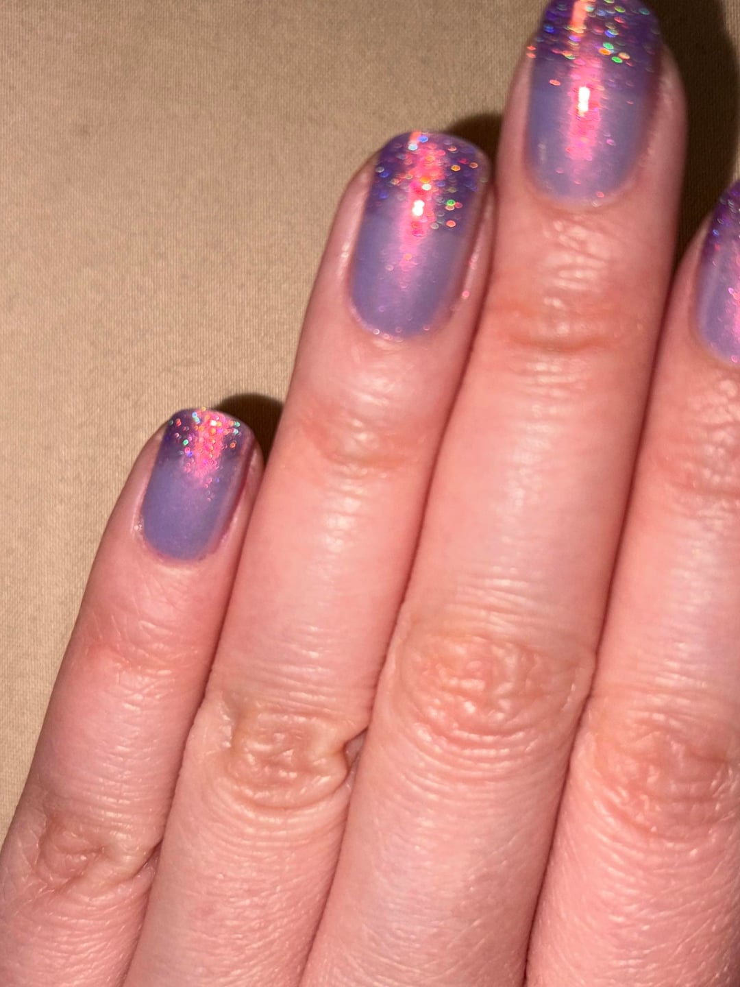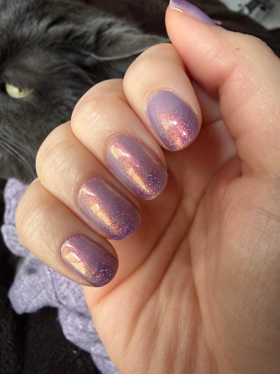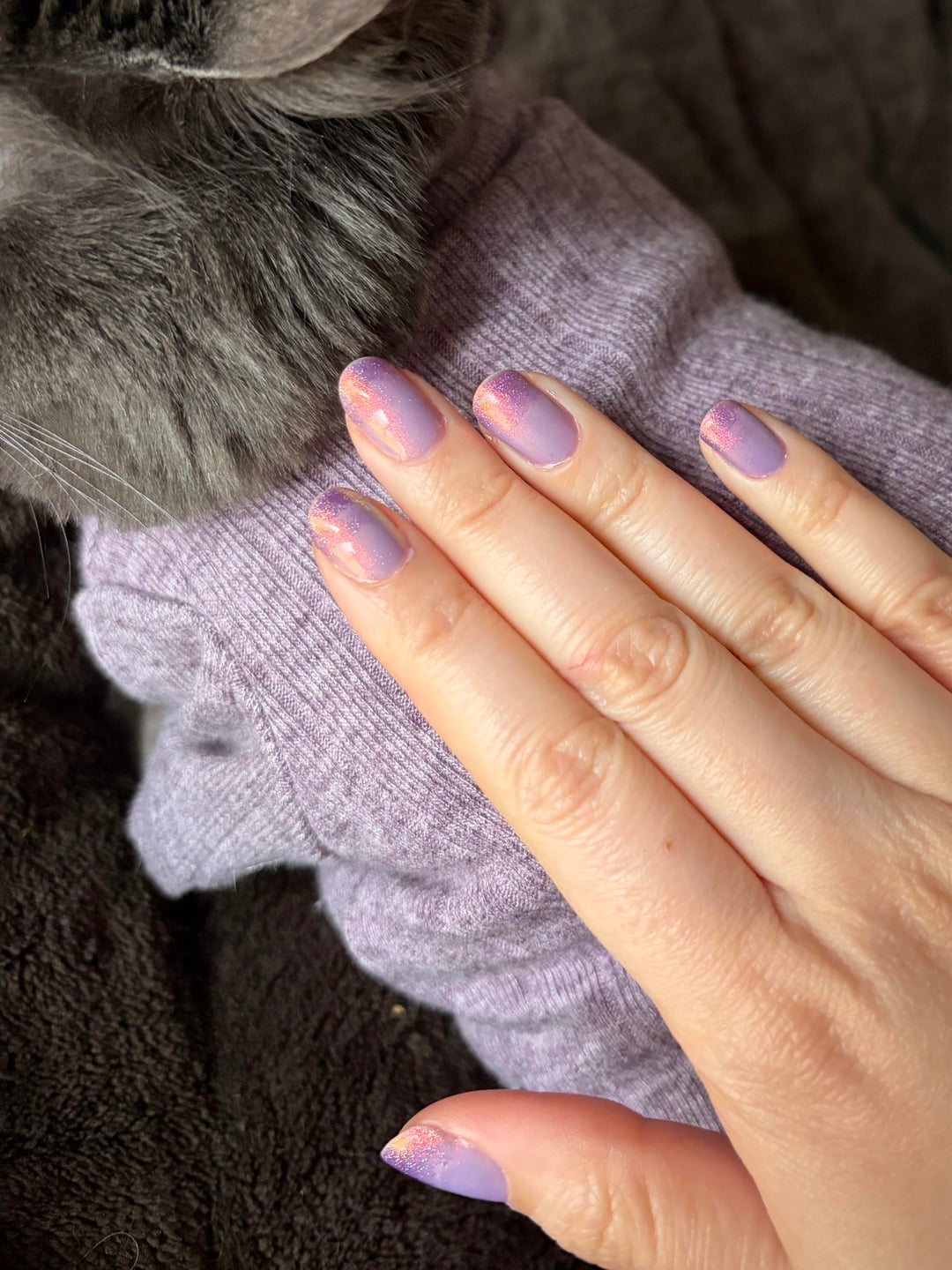 Here I did a very hasty ombre of 2 coats of each, with Fairy Dust towards the ends. Ft. my cat’s matching sweater since she was chilly.