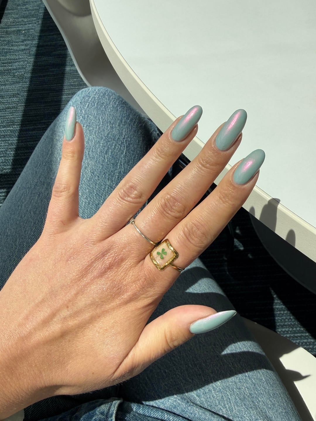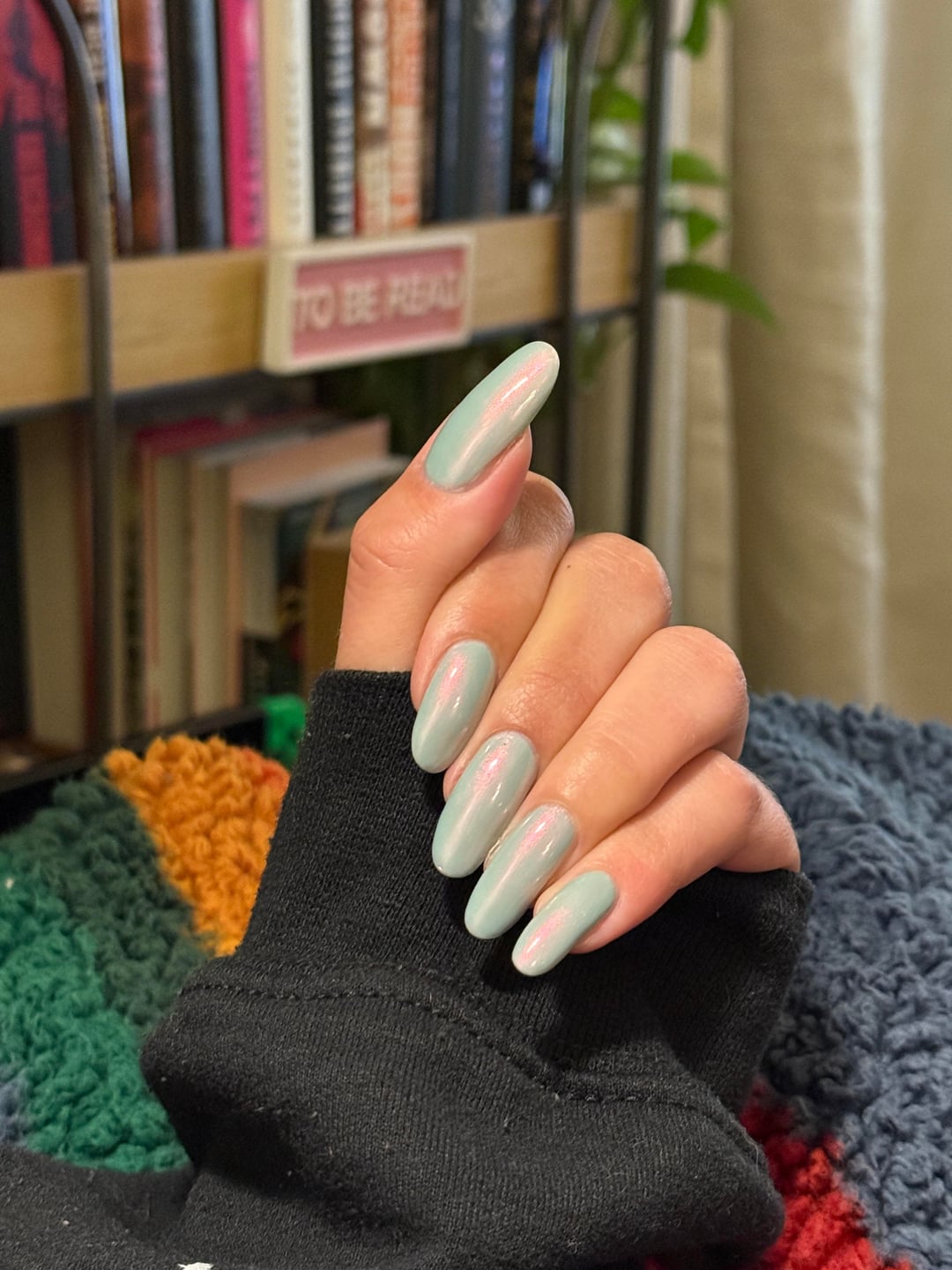 Firstleah on April 30, 2026 3:01 pm Holo Taco I was not familiar with your shimmer game! Wearing LA Colors base coat/top coat as a base, two coats of Holo Taco’s Moon Lagoon and Seche Vite topper