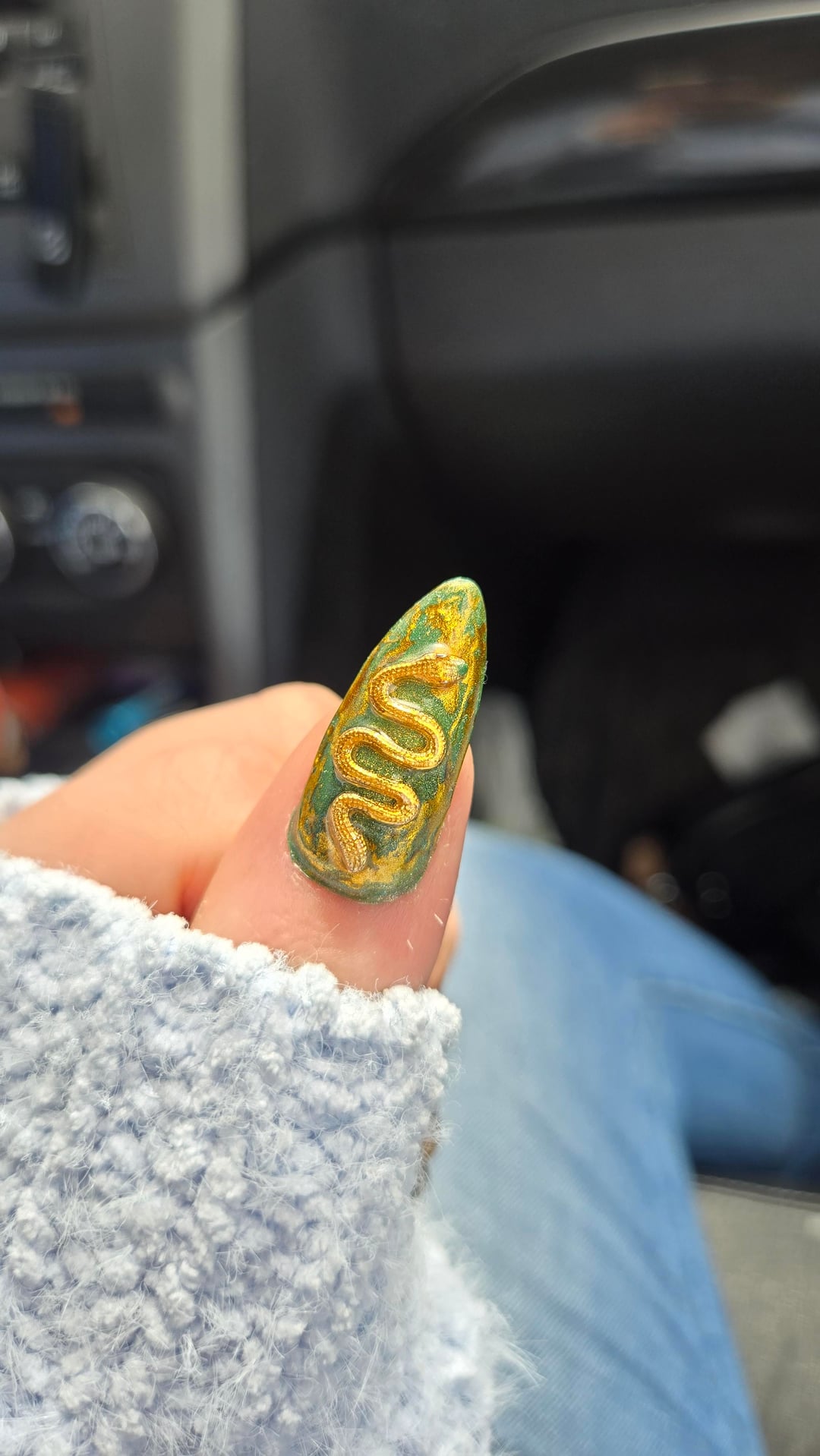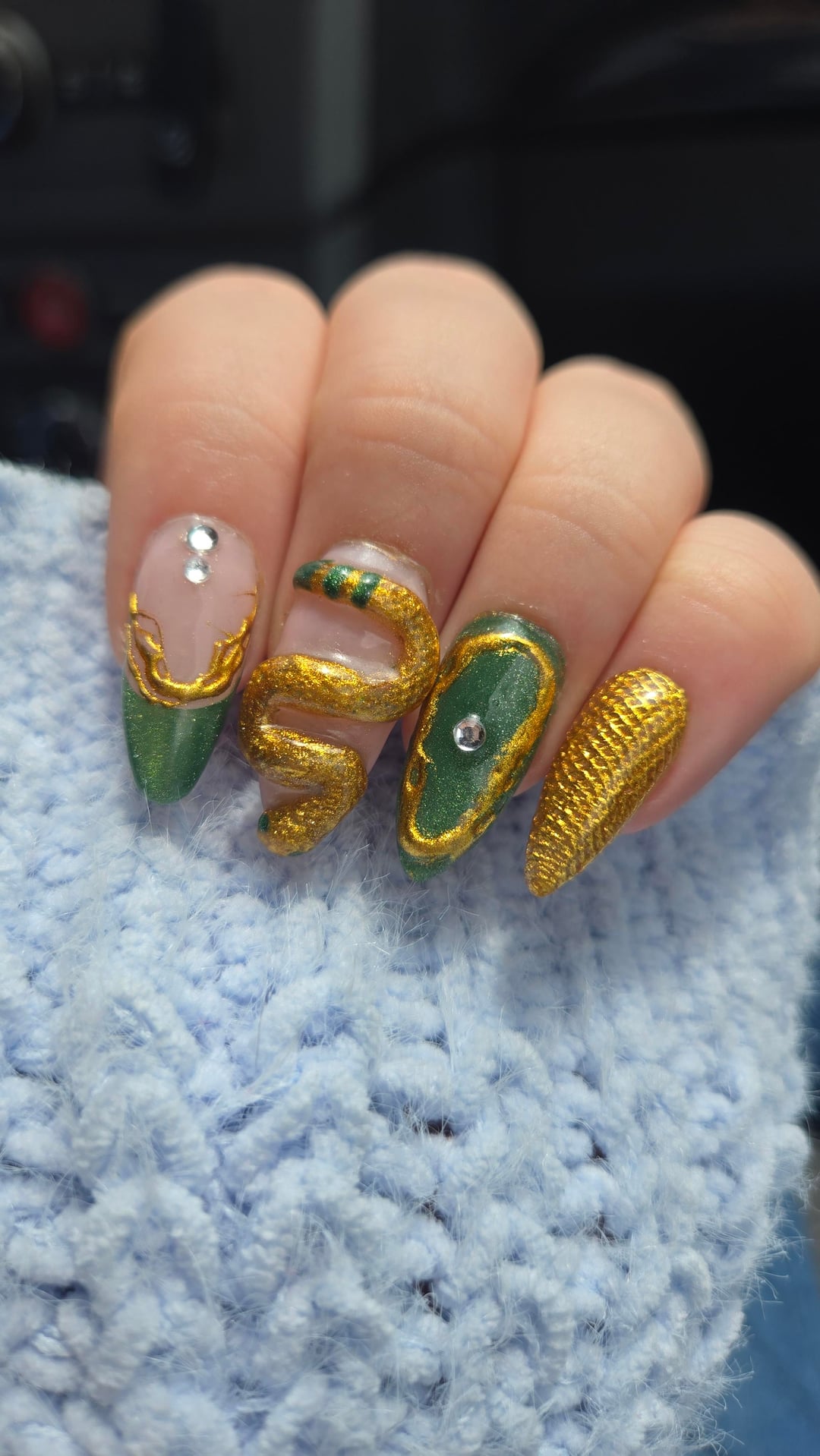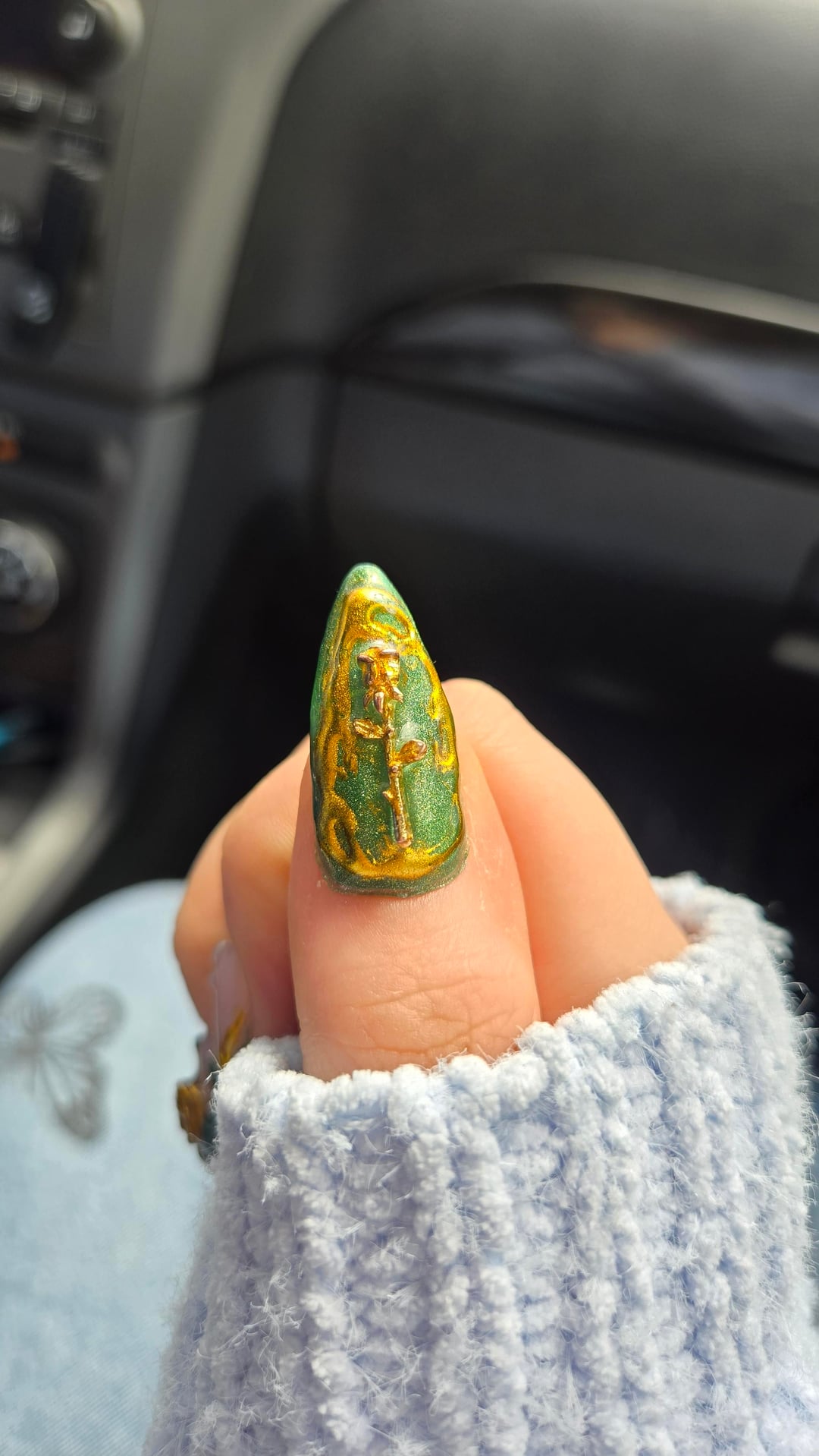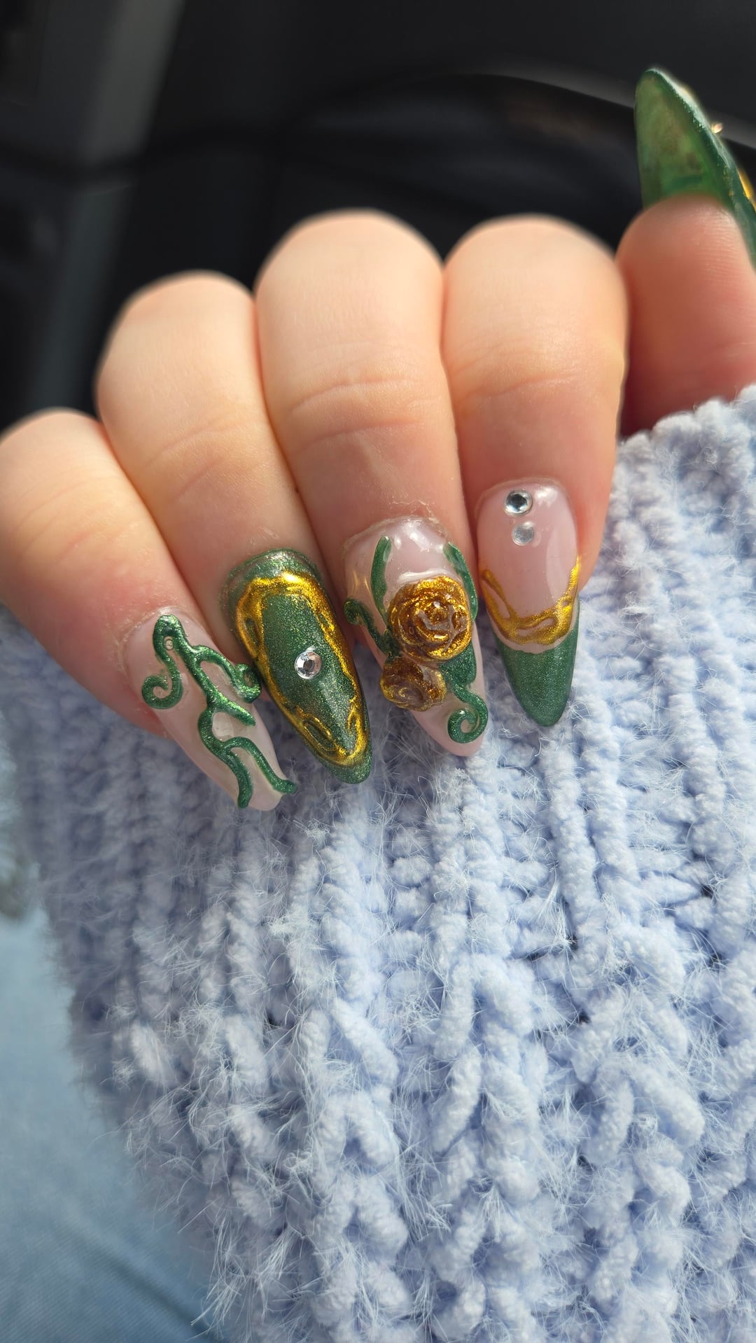 These are my birthday nails that u did myself, from the extension to the design (I even mixed the green color myself) I made everything/painted everything by hand except the charms on my thumbs (and the gems ofc lol). I've been doing my own nails since November, and I think I've definitely improved a lot but there is definitely a lot to work on still lol. Im going to be going to nail school soon so hopefully they'll get even better. Lmk what you guys think!🤗