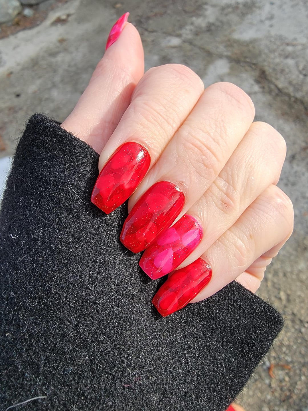 Pink nails: hand painted heart Holo Taco Left on Red, coat Cirque Colors Rose Jelly, hand painted heart Holo Taco Not Milky White, coat Cirque Colors XOXO jelly, Holo Taco Scattered Holo Taco, coat Cirque Colors XOXO Jelly… I switched jelly colors cause I didn’t like the look with rose