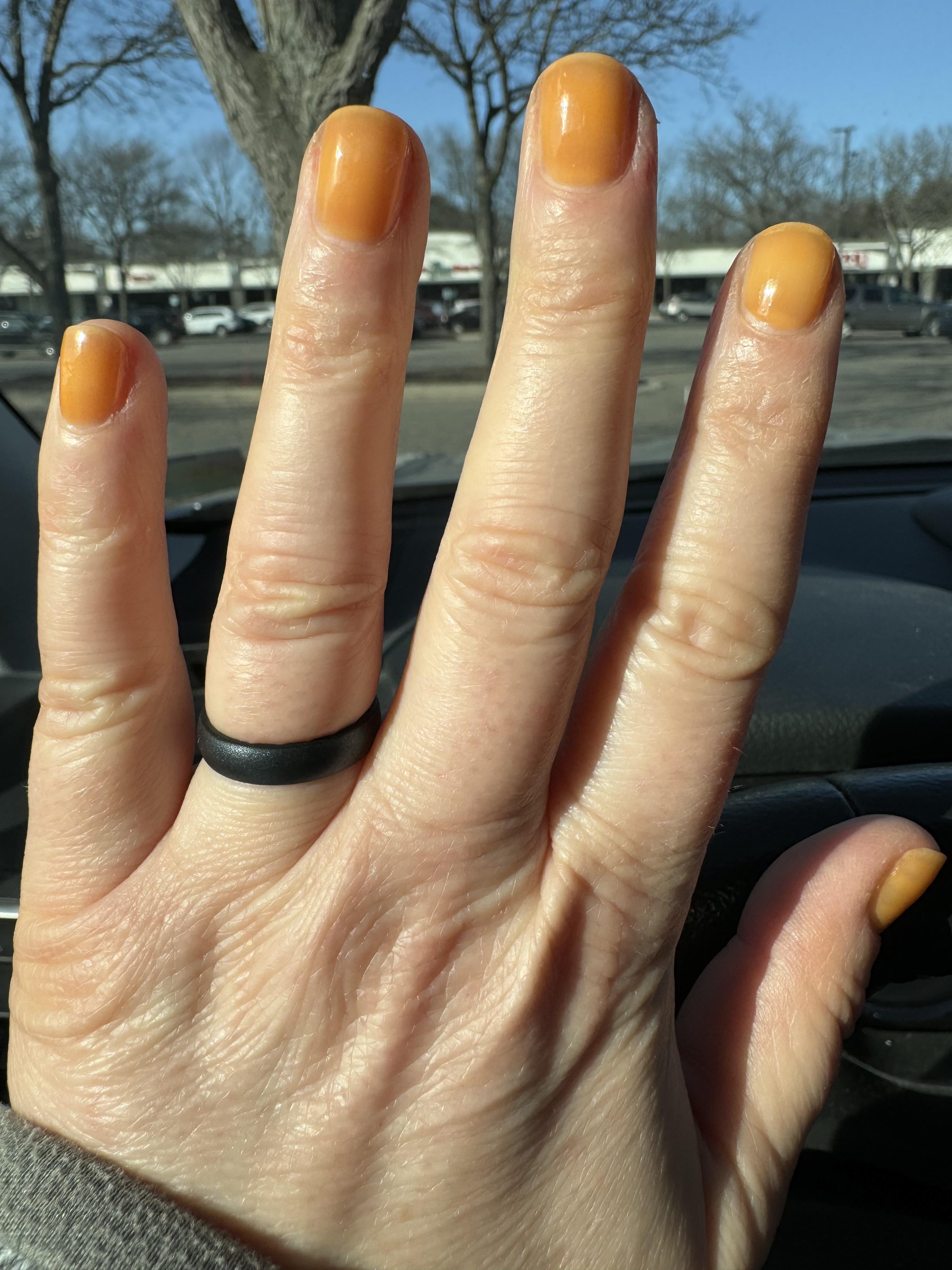 Love this sunny orange on an unusually bright and warm winter day. Cirque Clean Slate Ridge Filler, Cirque Saffron Jelly, and Opi Top Coat.