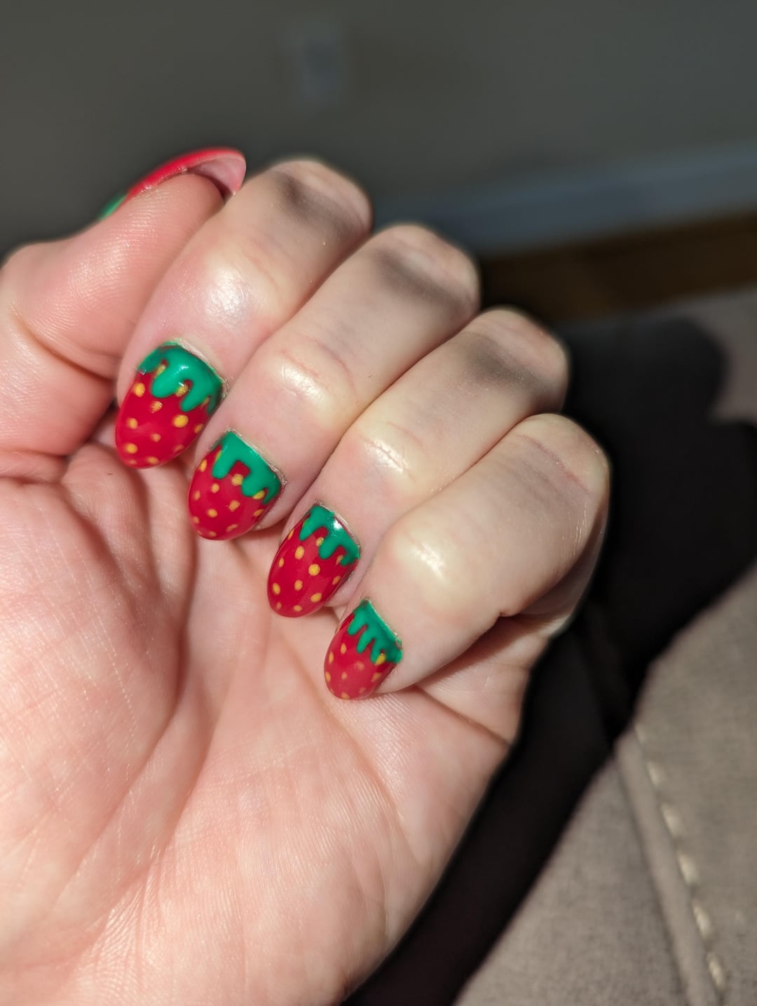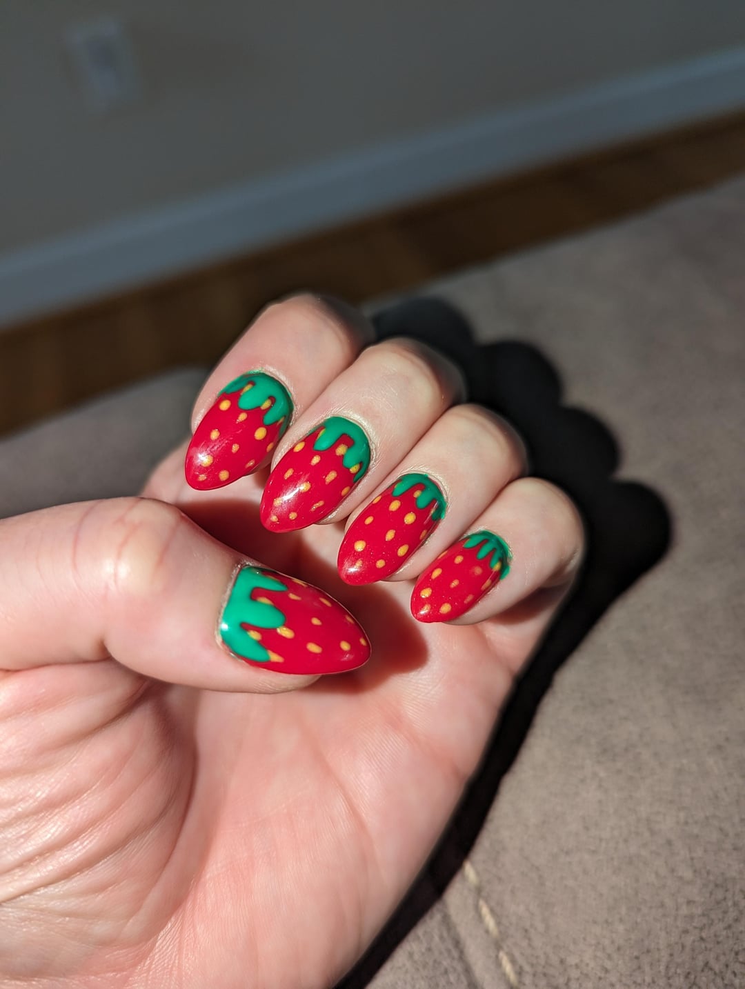 On Thursday, I went to a salon and asked them to give me “strawberry nails.” I am thrilled with the appearance. Unfortunately, due to the green “leaves,” my manicurist kinda had to flood the cuticle.