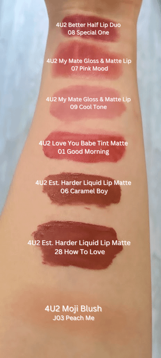 * **4U2 Est. Harder Liquid Lip Matte** – A very nice liquid lipstick that is mask proof + transferproof, super slim and has durable packaging for those who keep their lippies in their purse. I really like the shade Caramel Boy, blended out with a finger or a lip brush, but it’s not as long lasting as the above two products. Unfortunately 4U2 is discontinuing these, but I decided to review them in case my Malaysian budget ladies on this subreddit want something more lightweight than the Wardah liquid lipsticks. They’re on sale on the 4U2 Malaysian website for 9.90 myr.
