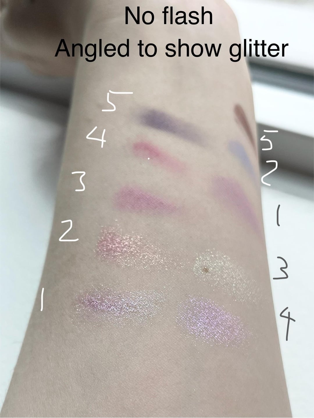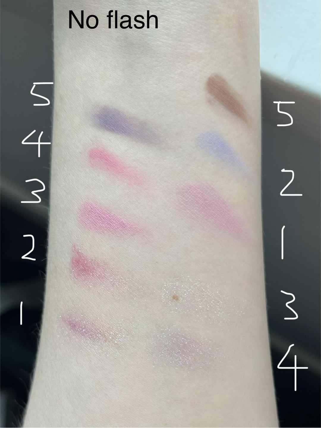 Violet Strawberry Rococo (VSR) is swatched in order from left to right (1-5) while Mermaid’s Dream (MD) is out of order because I wanted to see some of the shades next to each other.