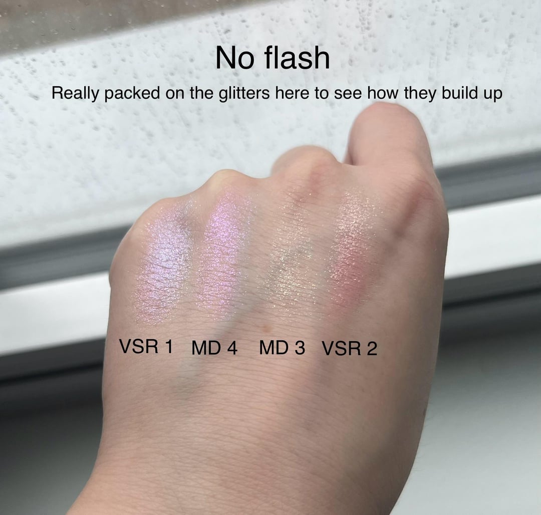 The glitters are very buildable, especially in VSR. I think the VSR 2 pink glitter builds up particularly well with a very strong rose gold pink hue.