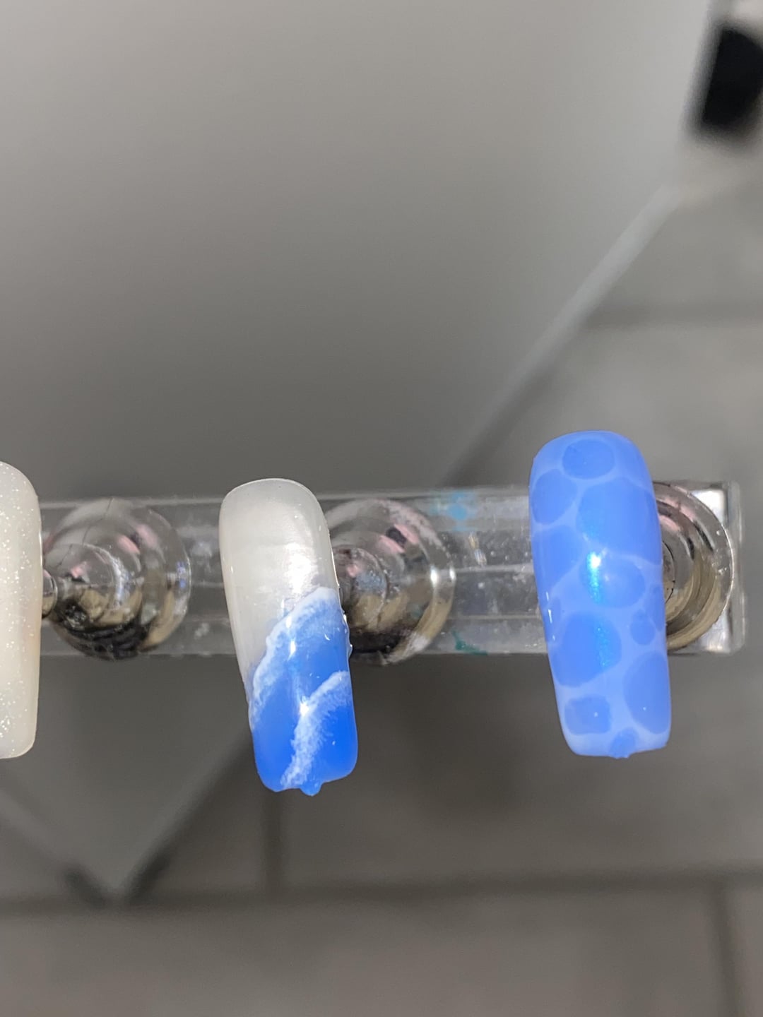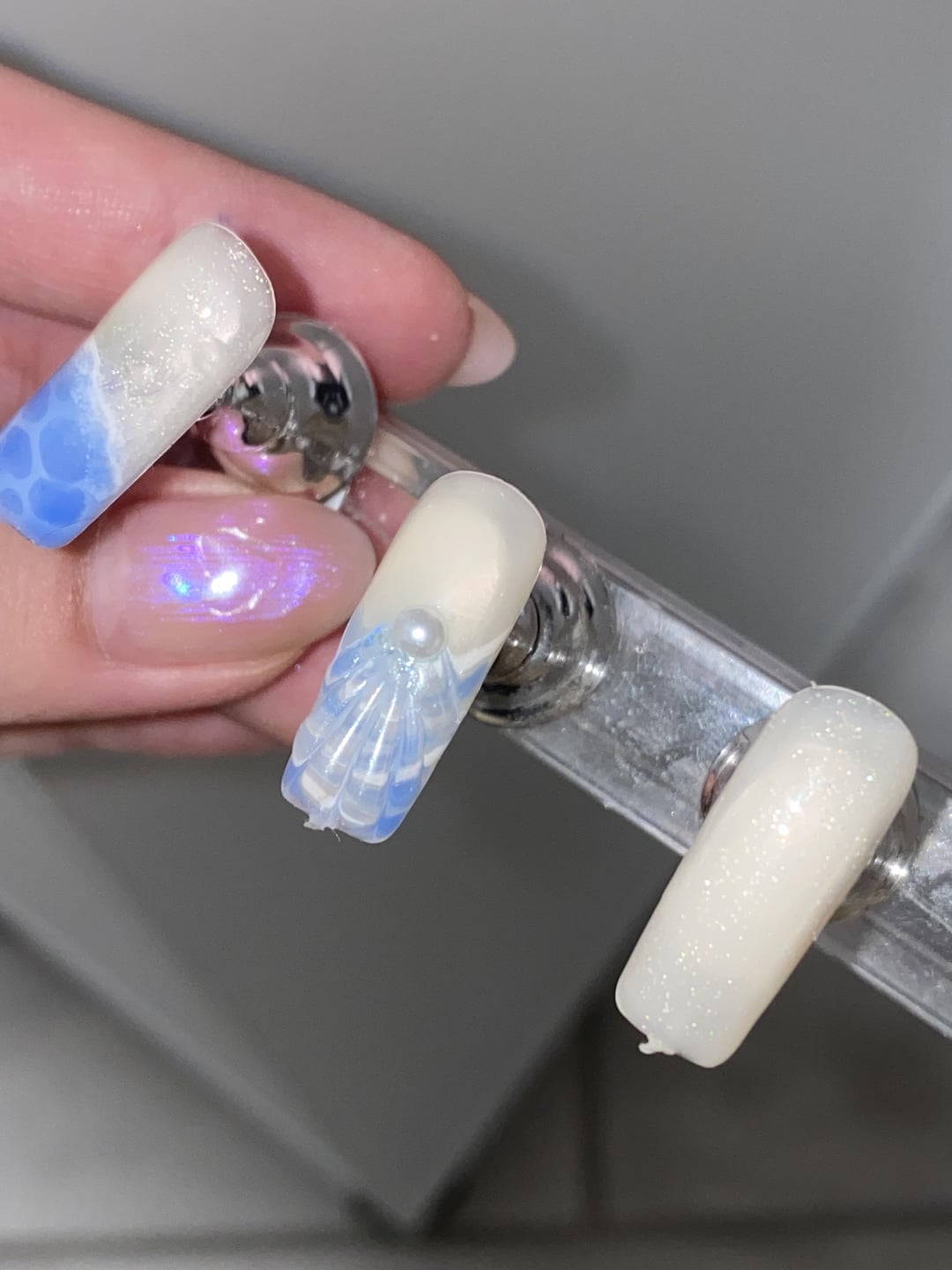 Some ocean/beach nail samples I did on full cover tips to see if my friend liked the design before doing a gel overlay on her natural nails! I added charms and more pearls on her nails, but didn’t want to waste adding them to the sample nails. I wish I had pictures of her final set but it took me 5 hours, it was midnight, and we both had work the next morning so I didn’t have it in me to keep us any longer. I asked for nailfies when she’s at the beach next week with them though, and will update if I get any 🙂