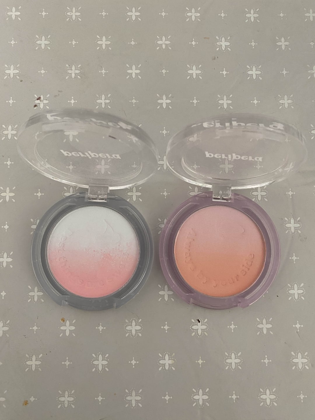 Here’s my honest review on the Peripera Pure Blushed Custom Cheeks. 02 is from the Night Peri line while 01 is from the more recent Soda Cafe line. They are pretty affordable depending where you get them, I always found them for $8 on OliveYoung. I bought 02 Fluffy Peach a while back out of curiosity and the $8 price point and I ended up very impressed because of the color payoff and smooth texture. I would even say its quality is comparable to the Flower Knows gradient blushes which are 3x the price. Both blushes swatch similarly at one swipe but you will experience kickback because of how softly-pressed they are. I was a pastel blush doubter because of my experience with Flower Knows blue blush but 02 Fluffy Peach’s lavender shade actually brightened my cheeks. It’s a vibrant gradient blush that does the job so **02 Fluffy Peach was a 5/5 for me.**