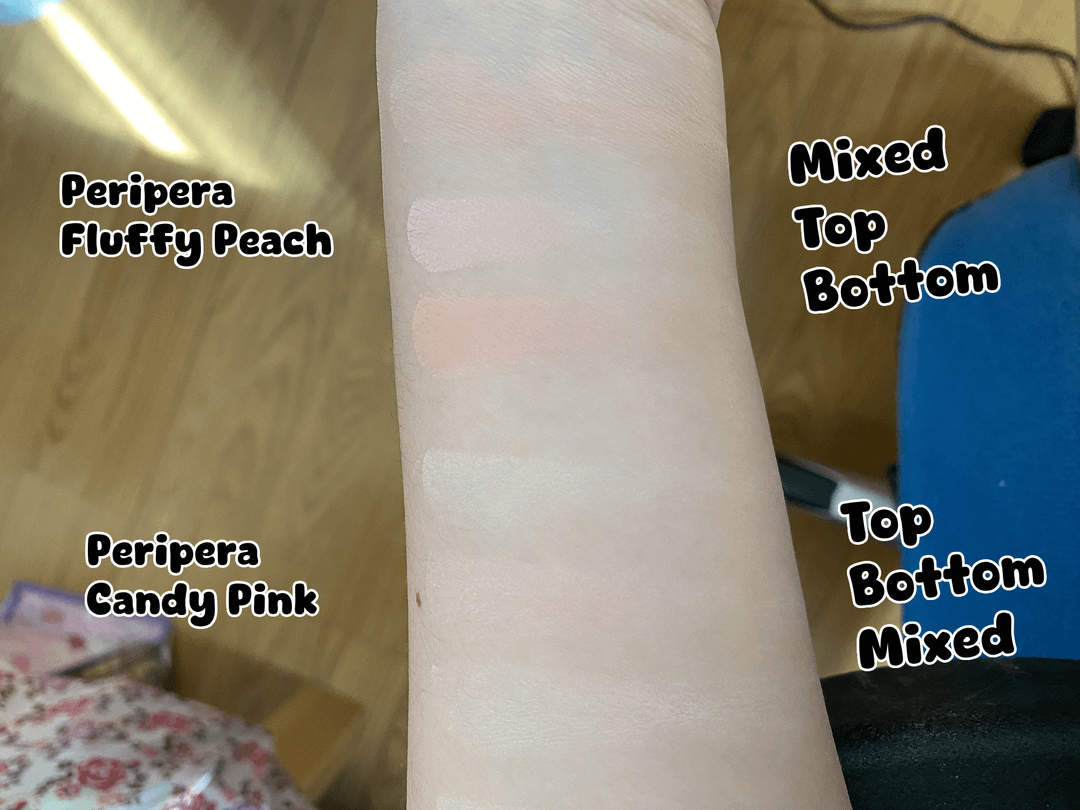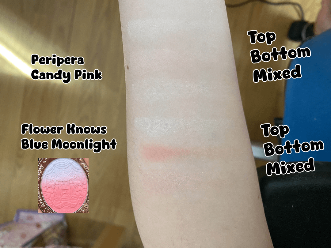 When swatching Candy Pink with one finger swipe I was confused as to why I didn’t get the same color pay off as Fluffy Peach. It seems that 01 is harder-pressed compared to 02 if you look at my fingertip comparison (P2) 01 comes off like chalky dust. Very disappointed because the official pictures show 01 to be just as pigmented as 02. The swatches for 02 match their official photos but 01 is a lie unless you were to dig hard into the pan and layer swatches multiple times to get the same result. The arm swatch picture (P3) is how both blushes swatch from just one finger swipe. I dont have any base products on my arm but if thats how 01 looks like on my arm you can guess how it would show up on my pale face over foundation. NON EXISTENT!! Unless I really took the time to apply multiple layers to get some kind of brightening effect but thats time consuming in comparison to 02. I guess Peripera could not replicate the formula of 02 for this brighter pastel blue/pink shade. In this case the Flower Knows gradient blush beats the Peripera one I was hoping would be a cheaper alternative.